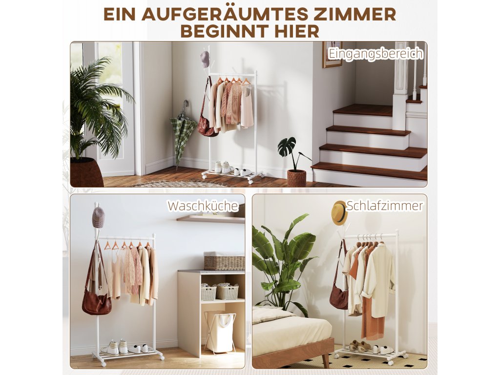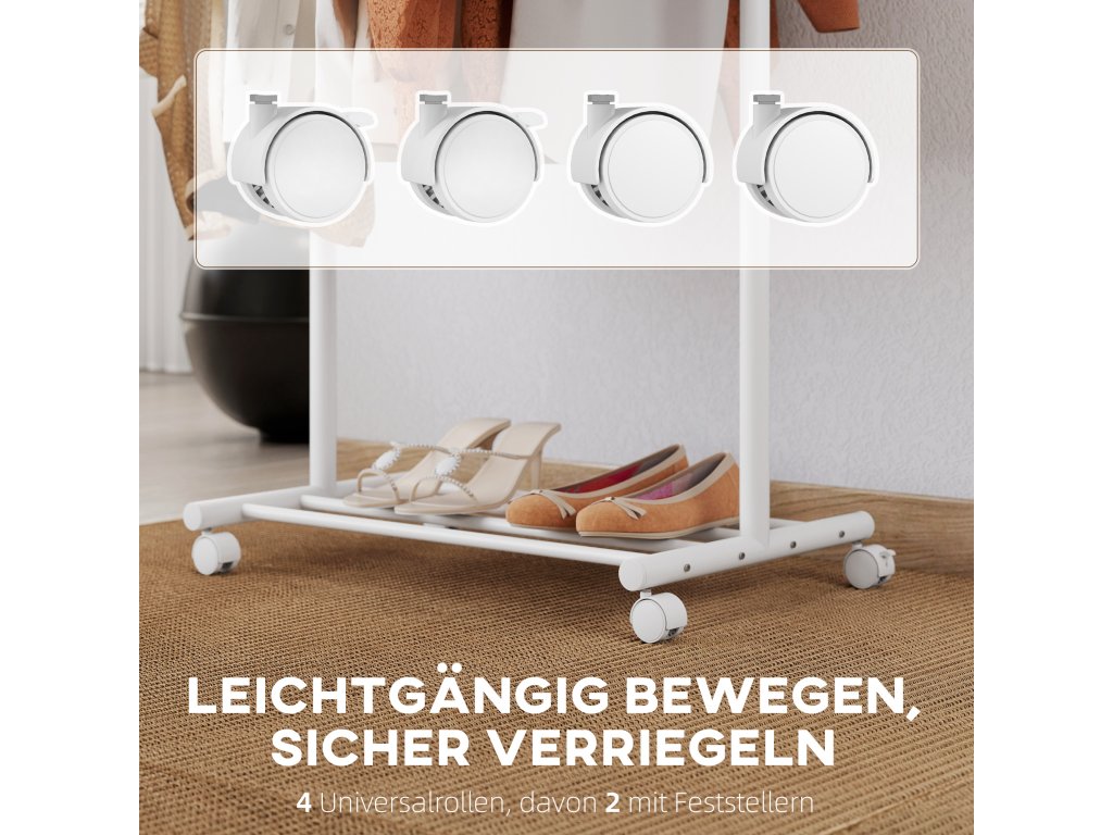 - Mobilita bez námahy: Díky čtyřem kolečkům s hladkým chodem lze tento věšák na oblečení bez námahy přemisťovat, přičemž dvě z nich jsou uzamykatelná a zajišťují optimální stabilitu.