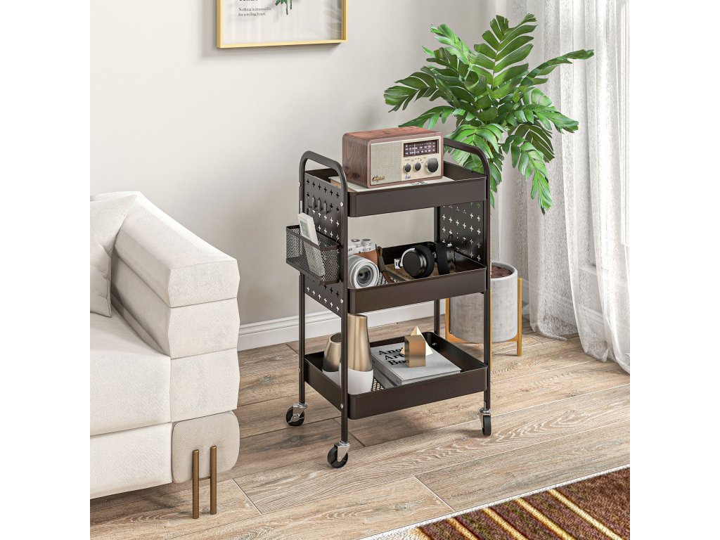 Tento kompaktní vozík od společnosti HOMCOM je ideální pro malé místnosti, kde je potřeba více úložného prostoru. Síťované koše a boční háčky nabízejí dostatek prostoru pro různé potraviny nebo příslušenství. Je vybaven snadno vytahovatelnými rukojeťmi pro snadnou přepravu. Čtyři hladce se pohybující kolečka se dvěma brzdami umožňují přesunout výklenkový vozík, kamkoli potřebujete. Lze jej použít jako koupelnový vozík, servisní vozík, kuchyňský vozík a vozík na prádlo.