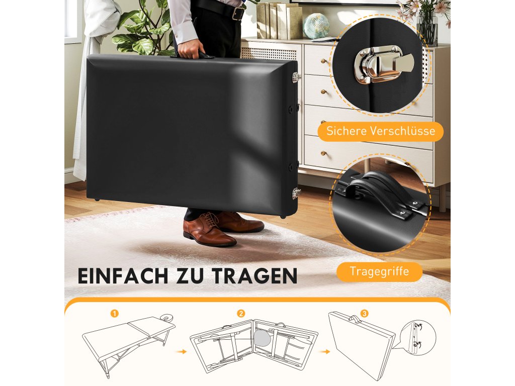 - Snadná montáž: Není zapotřebí žádné nářadí. Jednoduše rozložte skládací masážní stůl, nastavte čtyři nohy a připevněte polstrované příslušenství, to vše rychle a bez námahy