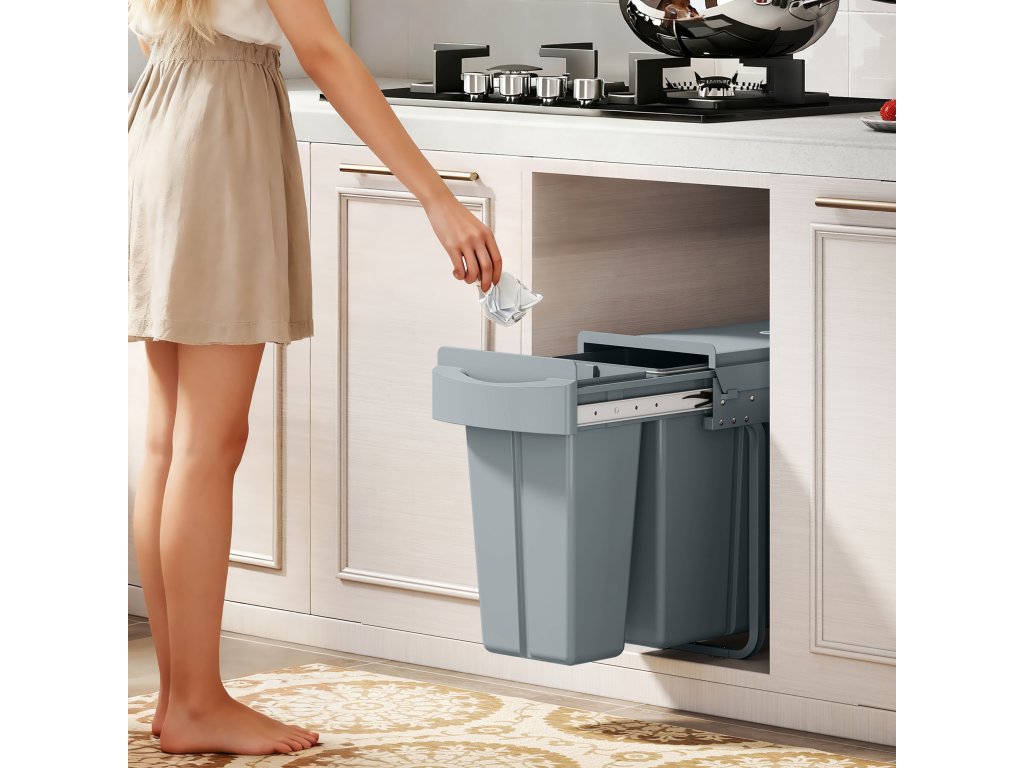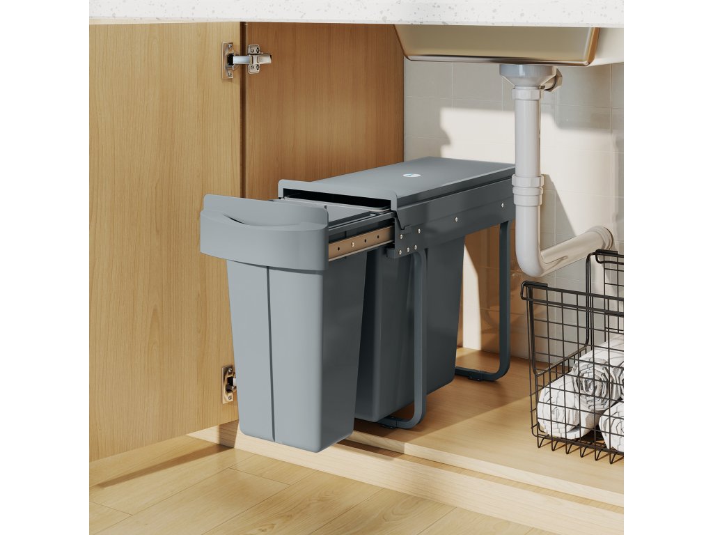 - kapacita 30 l: Tento koš pod pracovní desku nabízí dvě přihrádky (20 l + 10 l) pro pohodlné třídění odpadu a recyklace a pomáhá udržovat pořádek ve vašem prostoru. Ideální pro různá prostředí, jako jsou kuchyně, ložnice, kanceláře a pracovny