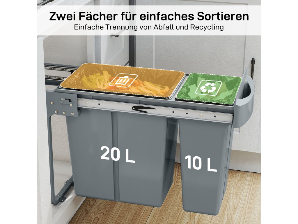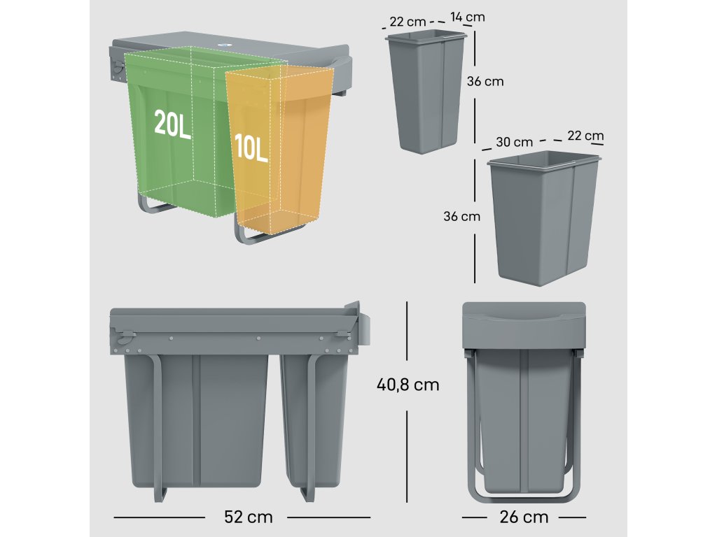 - ✔ Dvě nádoby (20 l + 10 l) nabízejí objem 30 l pro snadné třídění odpadu