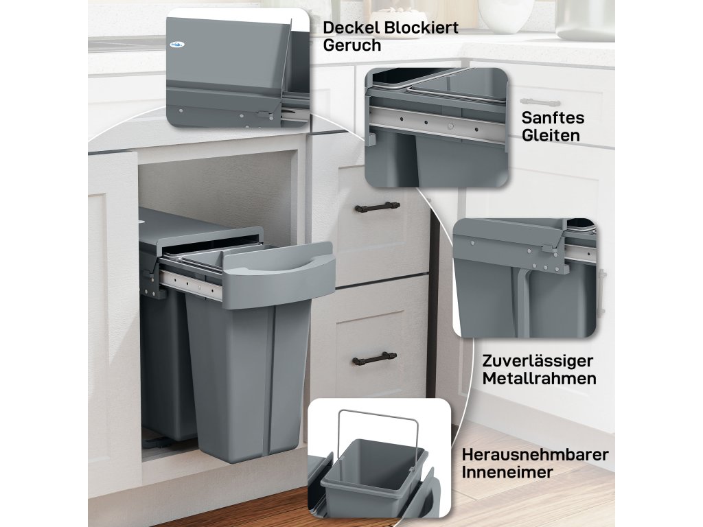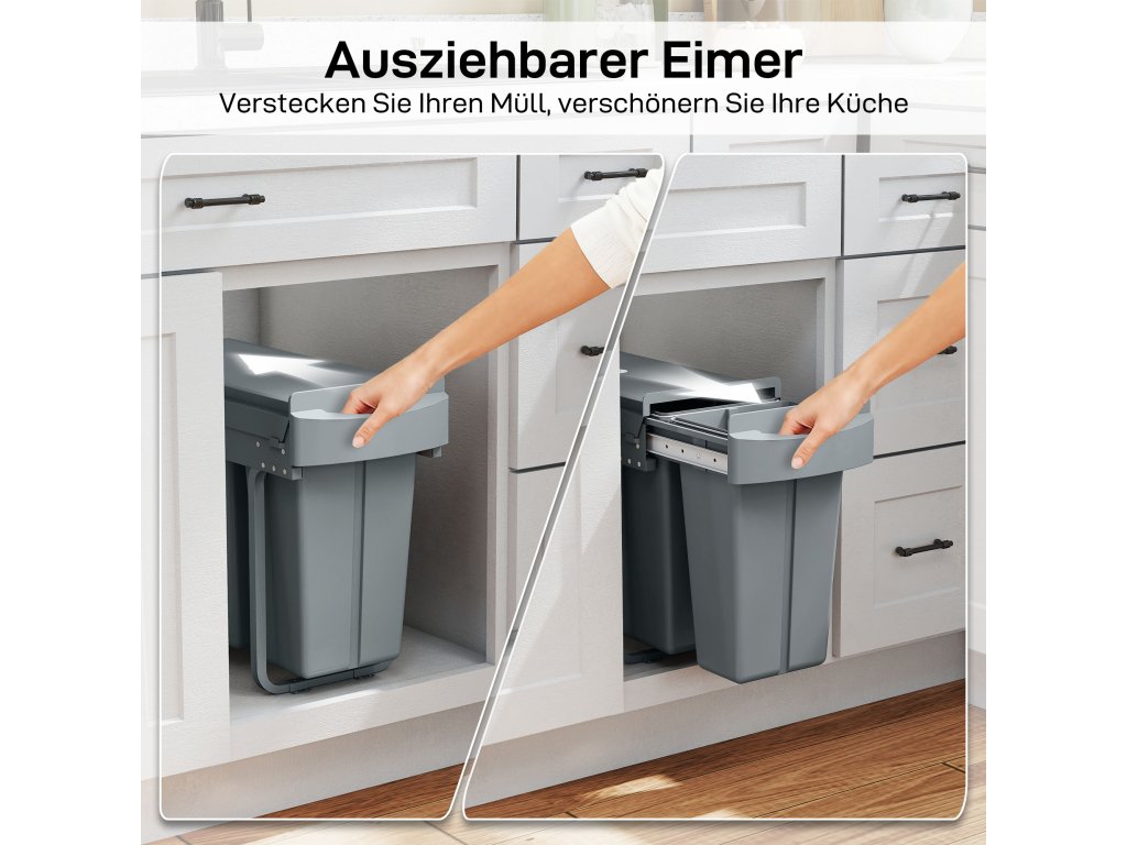 - ✔ Posuvný systém Soft-Close systému třídění odpadu klouže hladce a tiše a klade mírný odpor, aby zastavil malé děti nebo domácí zvířata