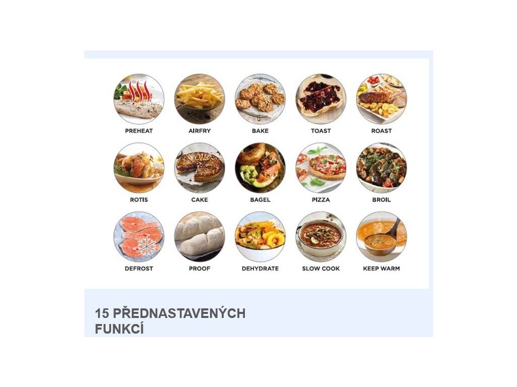 - Multifunční: Předehřívání, horkovzduch, opékání, pečení, grilování, rozmrazování, dehydratuje (suší), pomalé vaření, udržuje teplotu