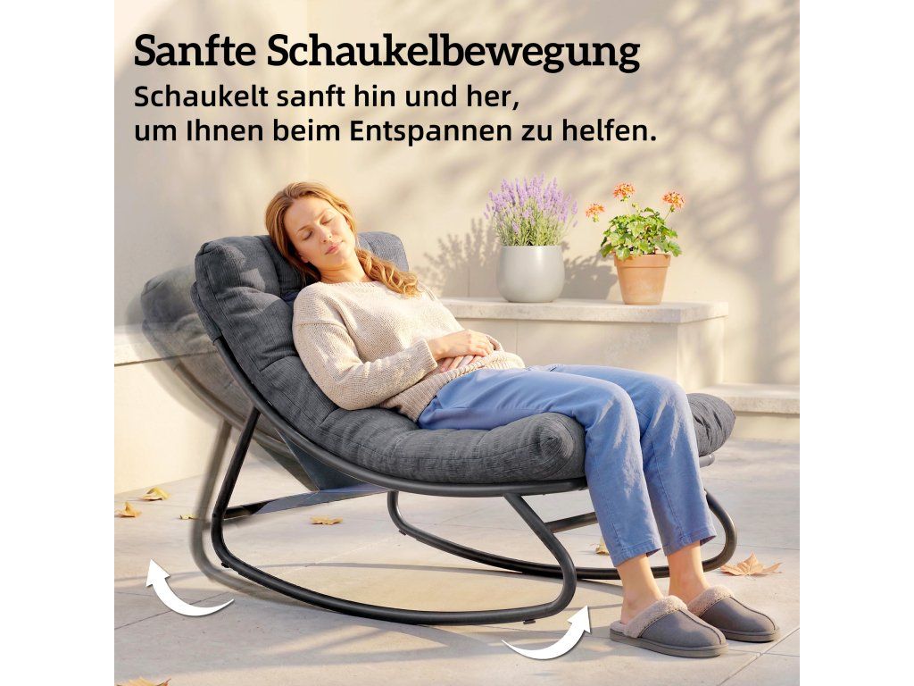 Jemný houpací pohyb: Užijte si snadné houpání v úhlu 115–175°, které snižuje stres a poskytuje pohodlí. Ideální pro čtení, vychutnávání šálku kávy nebo prostě jen relaxaci – čistá relaxace zaručena.