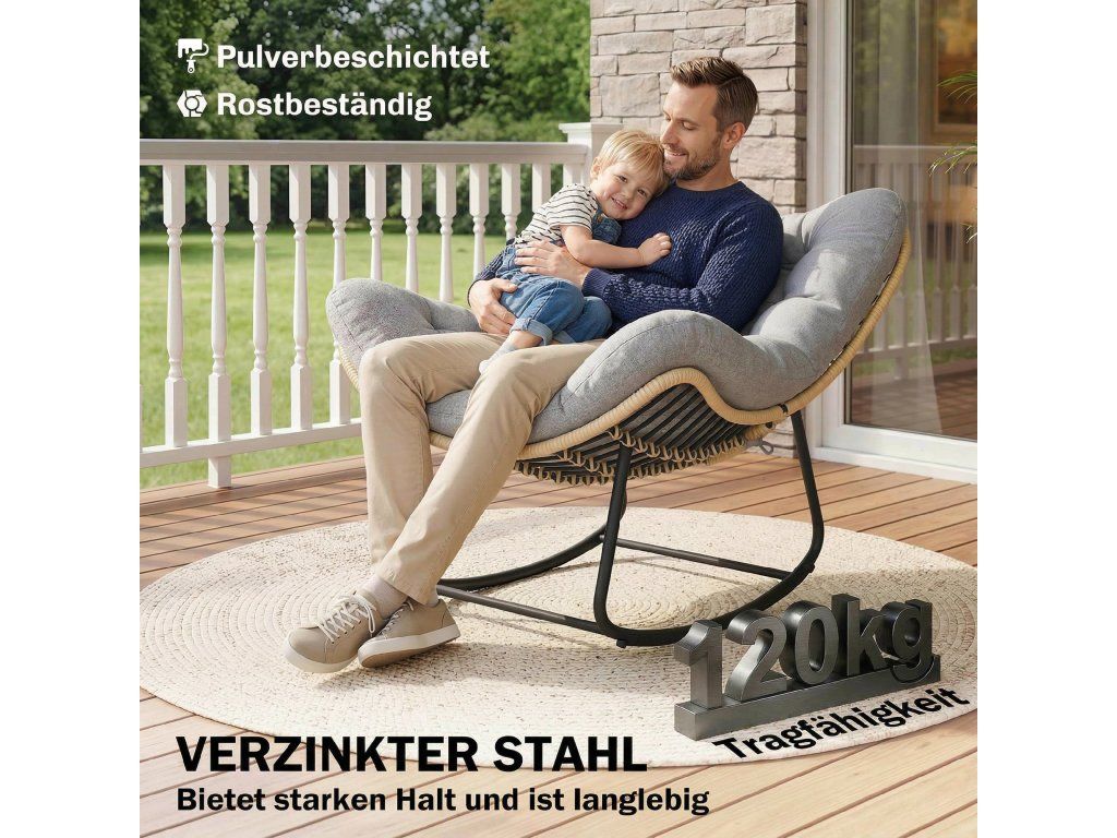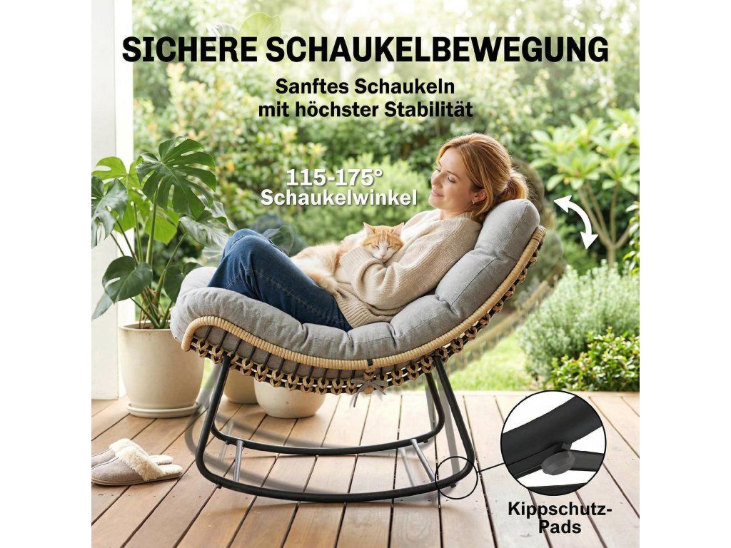 Mimořádně stabilní a bezpečné: Díky pozinkovanému ocelovému rámu a podložkám proti převrácení nabízí toto houpací křeslo nosnost až 120 kg a výjimečnou stabilitu. S mírným úhlem houpání 115–175 stupňů si užijete uklidňující houpání v naprostém bezpečí.
