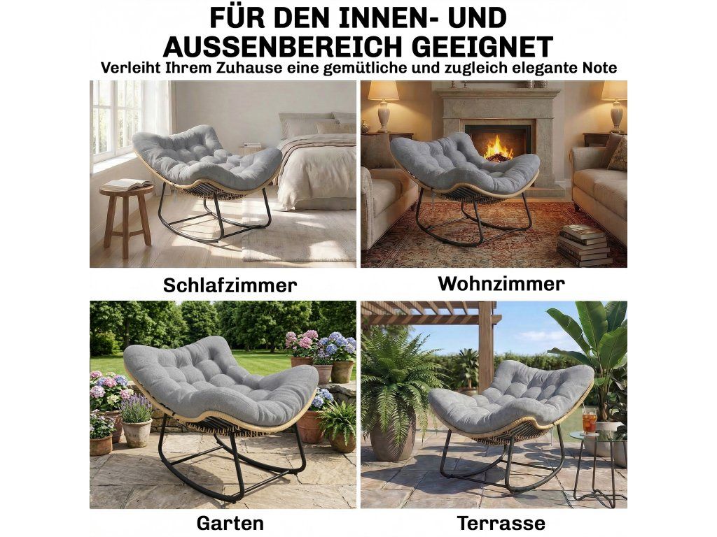 Vnitřní i venkovní použití: Toto houpací křeslo vyrobené z ručně tkaného PE ratanu kombinuje odolnost a styl. Rám odolný proti korozi s práškovým nástřikem zajišťuje dlouhou životnost, takže je ideální do obytných prostor, teras nebo balkonů.