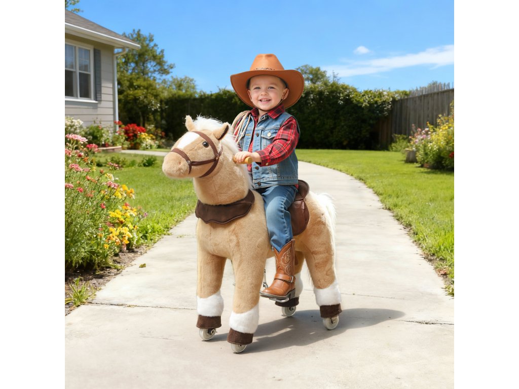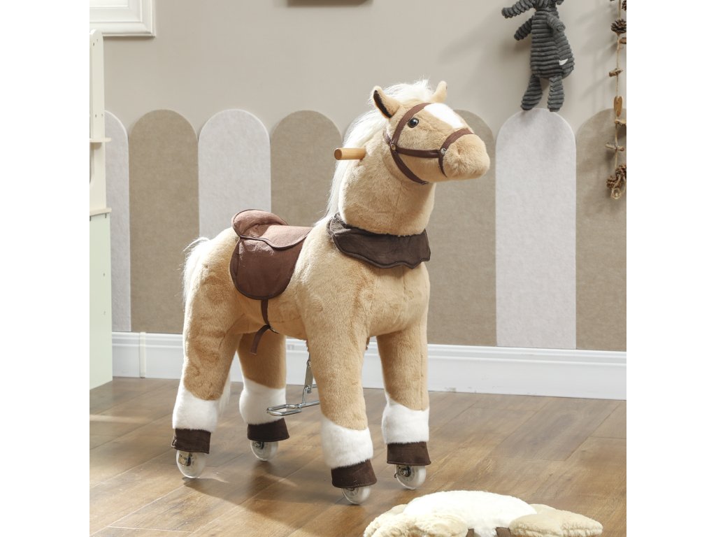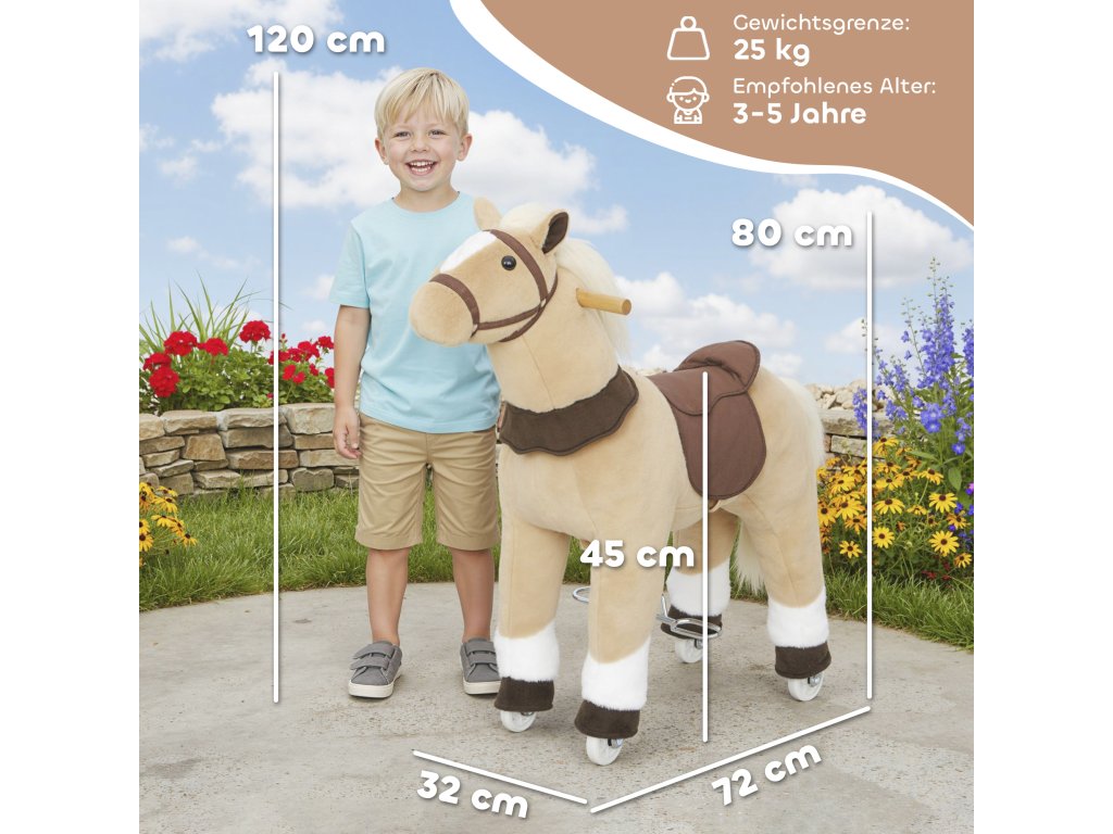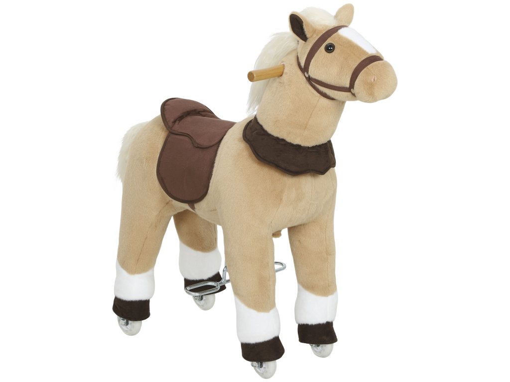 Houpací kůň pro děti, látkový potah, robustní rám, hladká kolečka, vhodné pro věk 3-5 let, hnědá