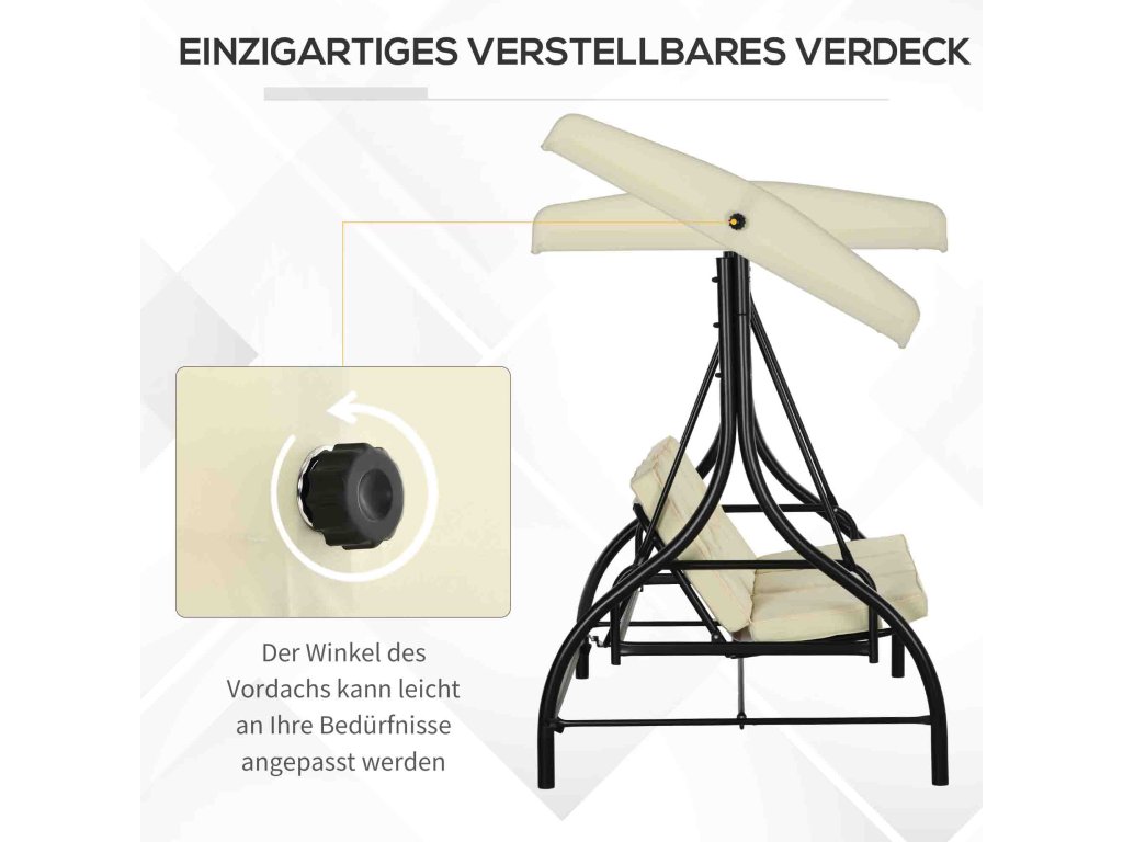 - Výklopná sluneční stříška: Nastavitelná stříška houpačky vás ochrání před intenzivním letním sluncem. Blokuje UV záření a chrání sedací plochu před listím, prachem nebo nečistotami. Nastavte si úhel sklonu podle svých představ, abyste se vyhnuli oslnění