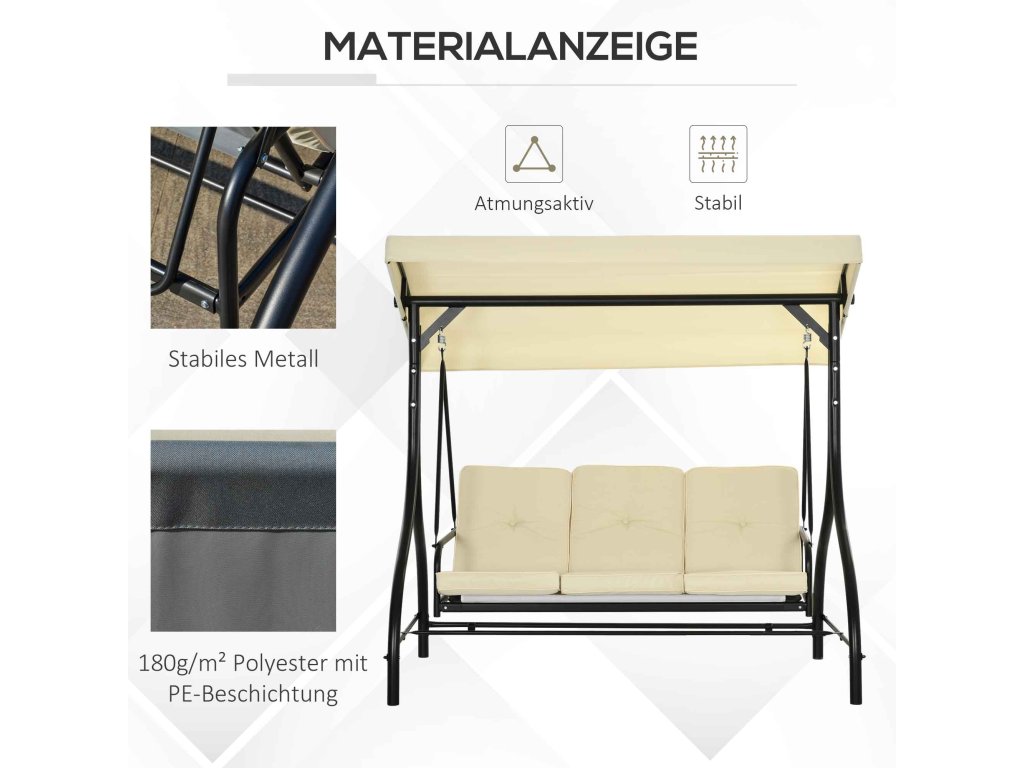 - Odolná konstrukce: Tato houpačka, vyrobená z robustního ocelového rámu, nabízí vysokou nosnost 240 kg. Práškově lakovaný povrch a polyesterová tkanina odolná proti povětrnostním vlivům zaručují dlouhotrvající radost z jízdy