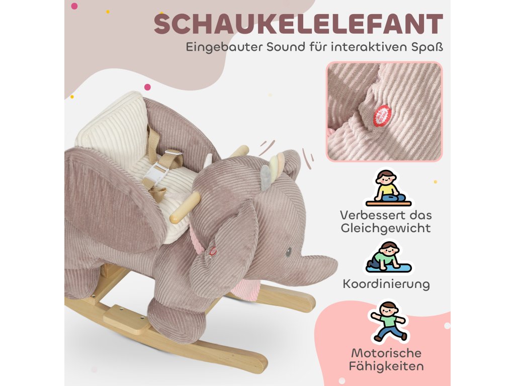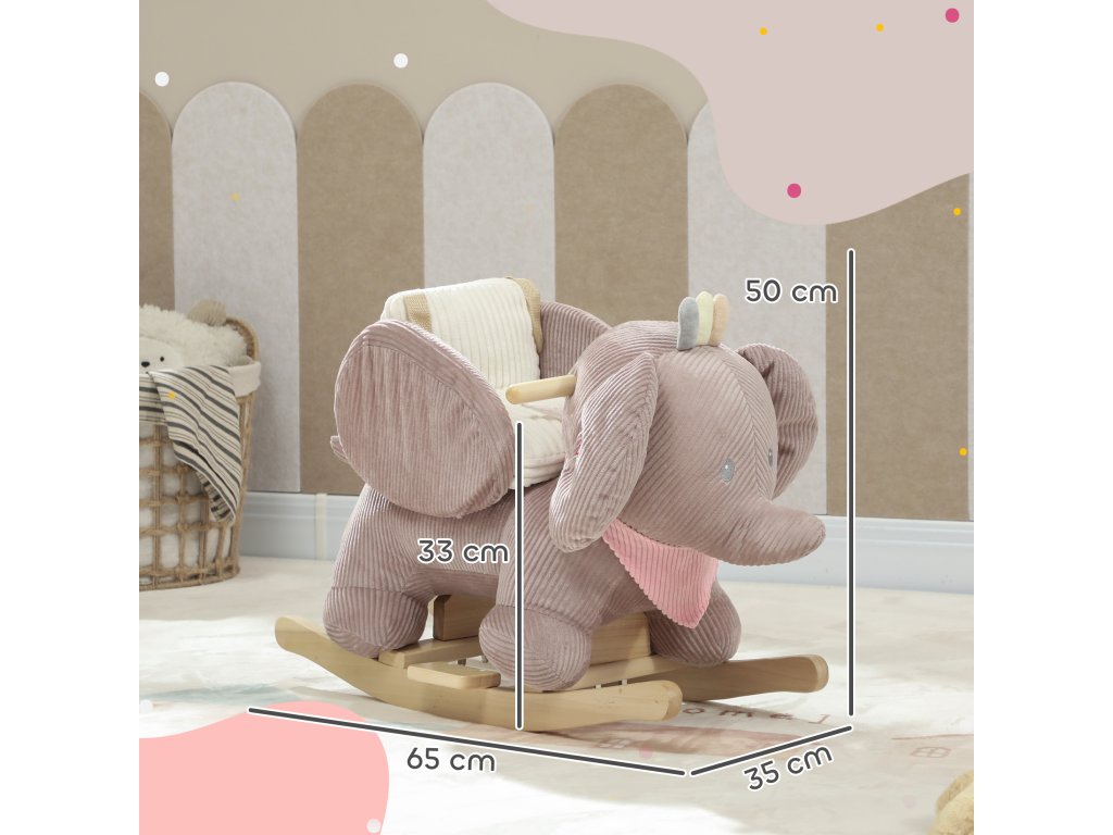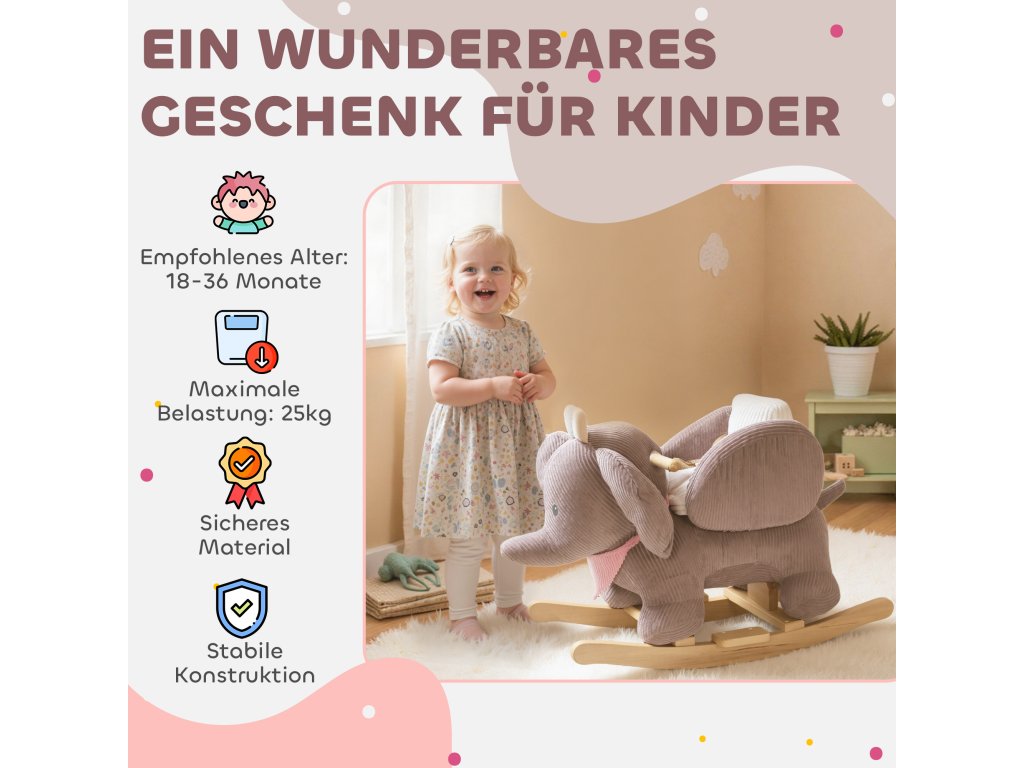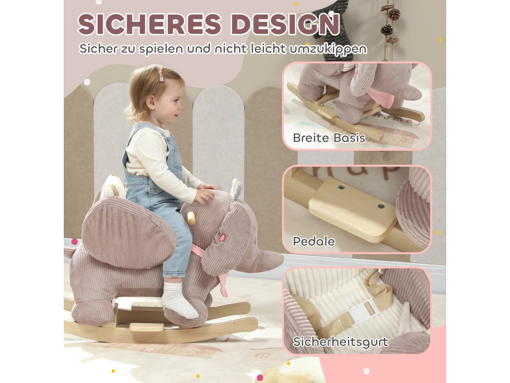 Tento rozkošný houpací kůň ve tvaru slona svými zábavnými zvuky promění každé houpání v radost. Houpací zvířátko je potažené měkkým plyšem a jemně ukolébává dítě pomocí bezpečného tříbodového pásu. Široké sedátko a pevná základna s snadno uchopitelnými rukojeťmi zajišťují stabilitu a rovnováhu. Tento houpací kůň je ideální pro děti a zaručuje bezpečnou a šťastnou hru.