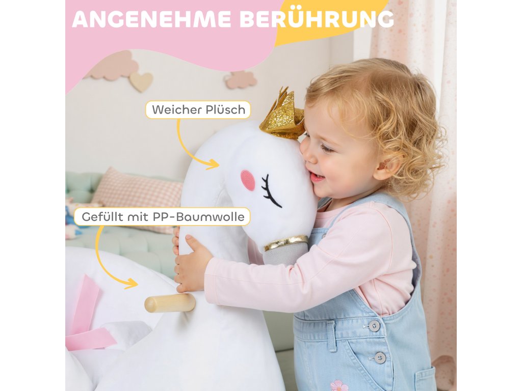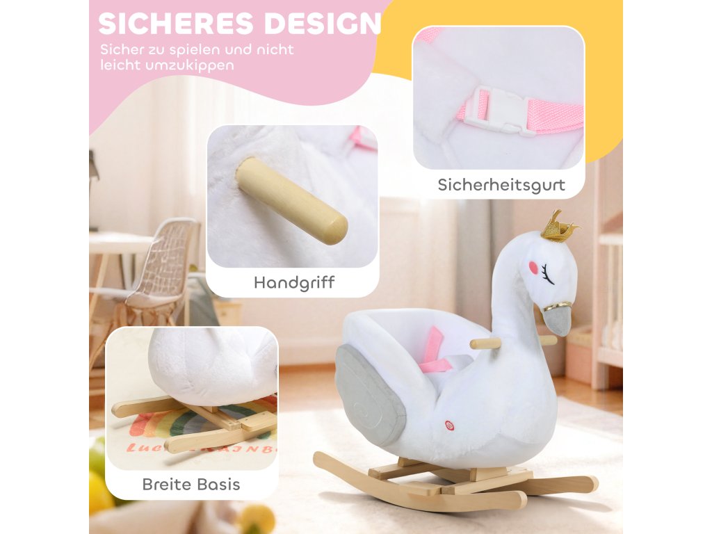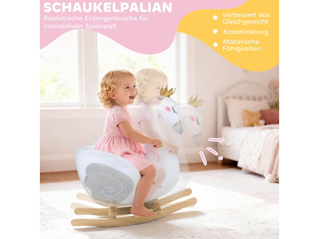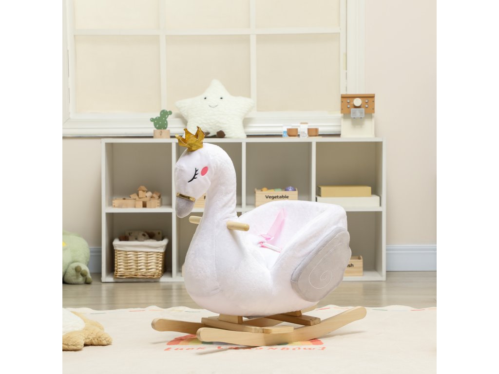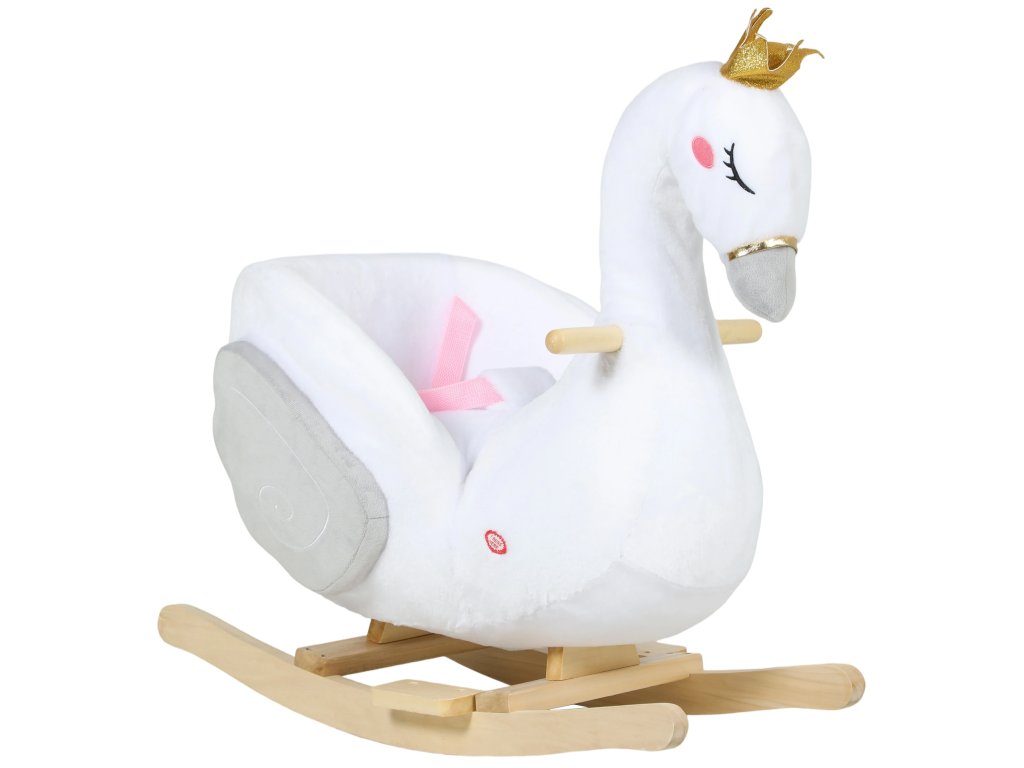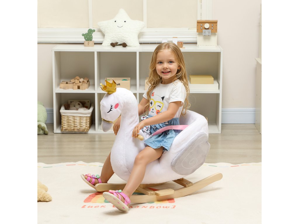 Snový design labutě: Tento elegantní bílý houpací kůň ve tvaru labutě, korunovaný magickou korunou a hrající jemnou ukolébavku, promění chvilku s pohádkami i čas před spaním v klidné a radostné chvíle pro batolata i jejich rodiče.