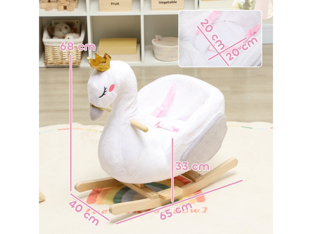 Houpací zvířátko, houpačka labuť s ukolébavkou, měkká výplň, dřevěný rám, pro děti 1,5-3 roky, 65x40x68 cm, bílá