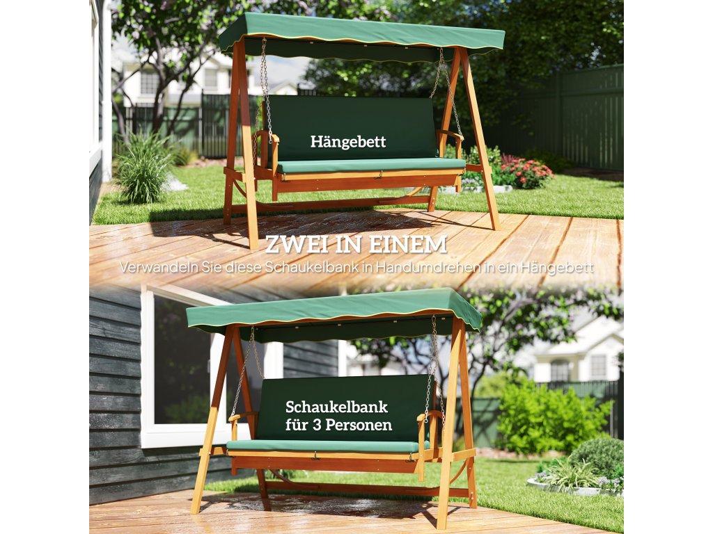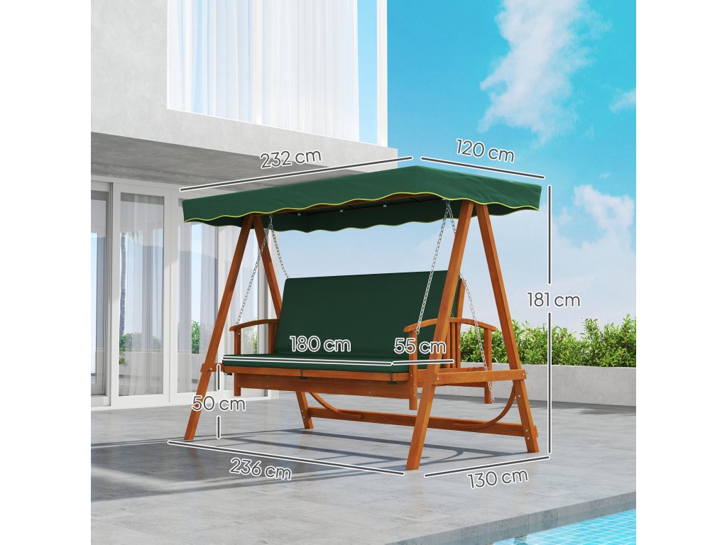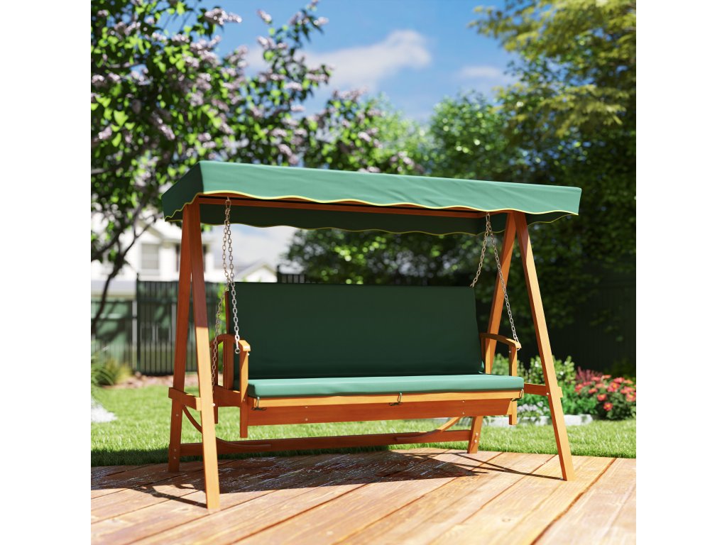 Houpačka na verandu Outsunny se střešním oknem, zahradní houpačka z pravého dřeva, houpací lavice s polohovací funkcí, pro 3 osoby, tmavě zelená