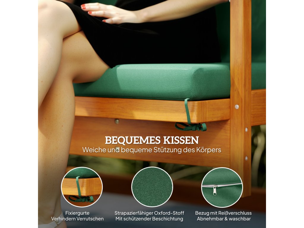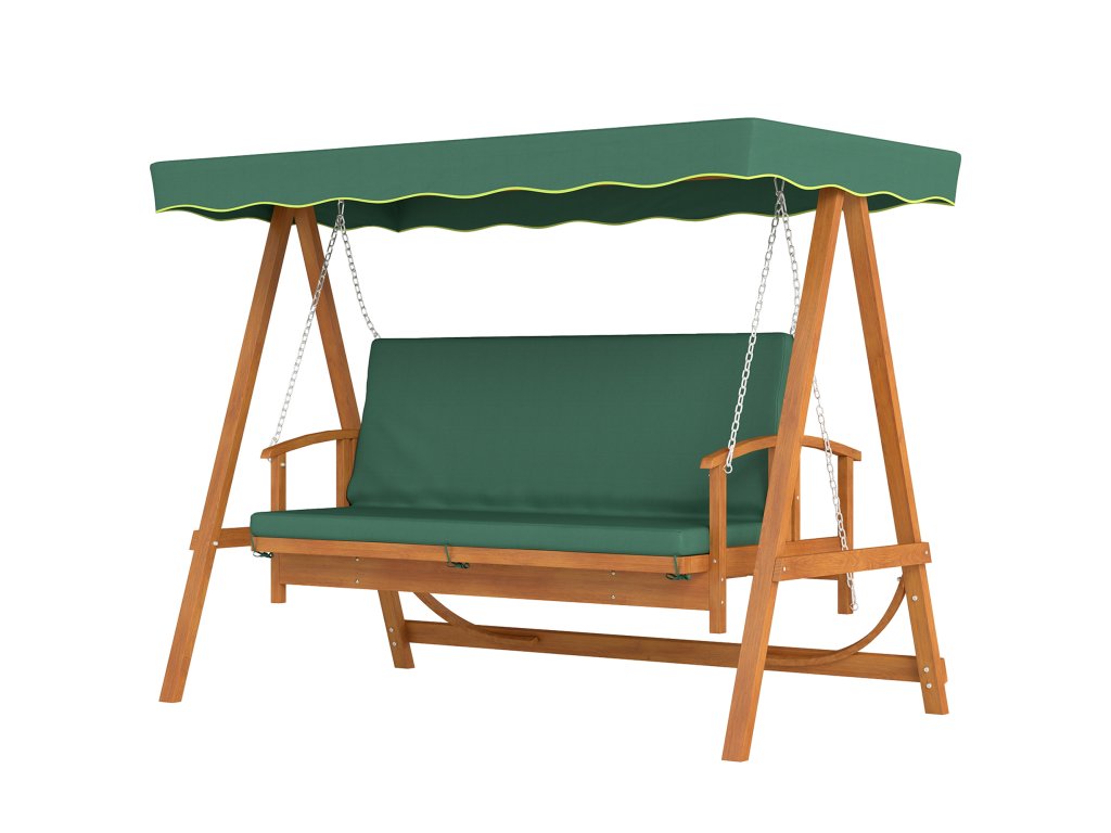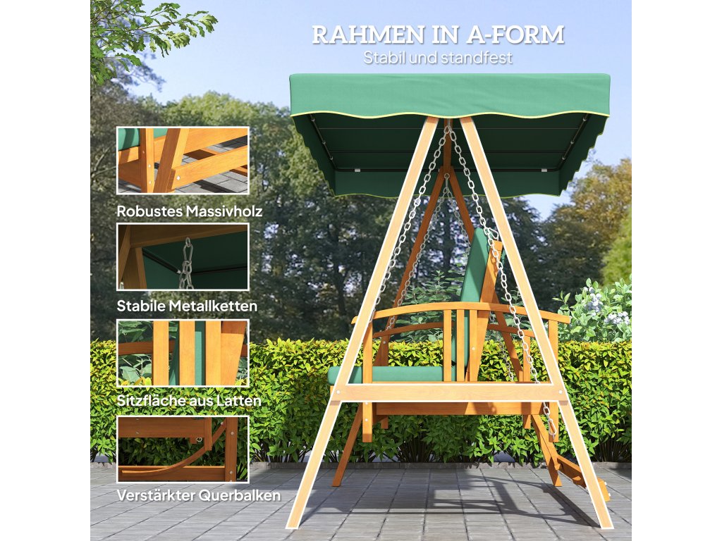 Pohodlné: Dřevěná zahradní houpačka je vybavena pohodlnými sedáky a stříškou s UV ochranou. Područky poskytují dodatečné pohodlí.