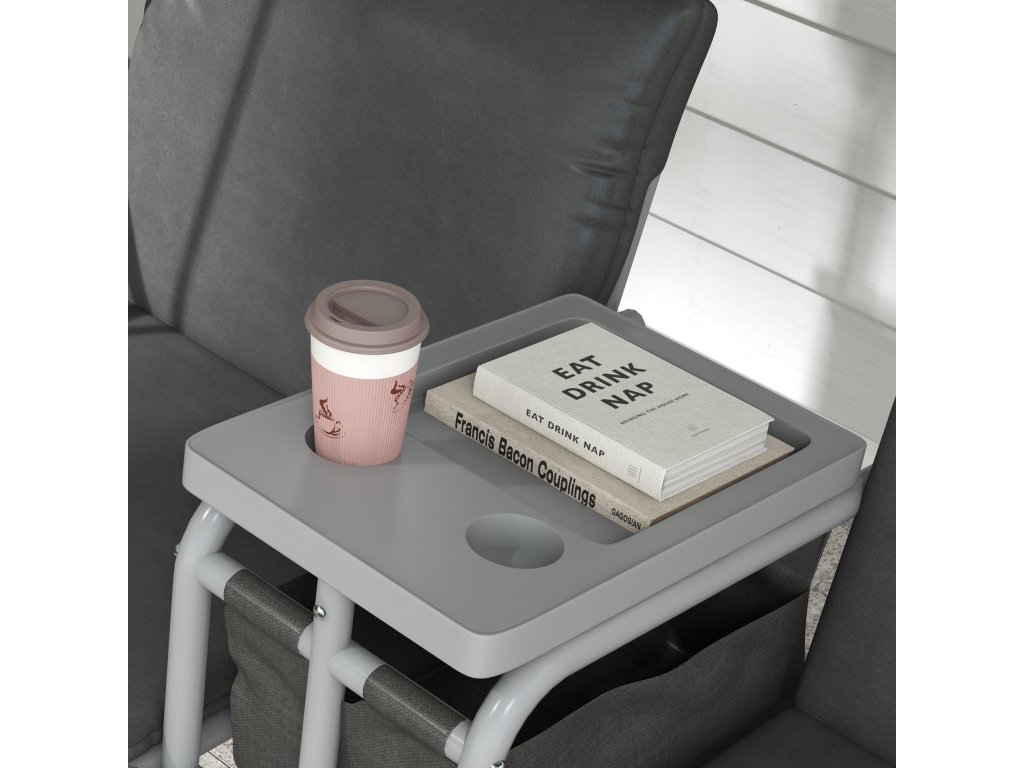 - Stabilní kovový rám a středový stolek: Konstrukce rámu ve tvaru písmene A zajišťuje vyvážené a pevné postavení. Praktický stolek s držákem na nápoje je ideální pro lahodné odpolední občerstvení