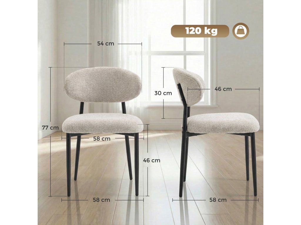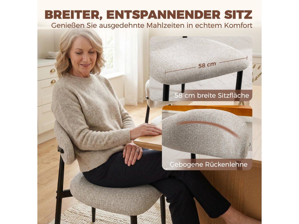✔ Užijte si vynikající pohodlí s velkorysým sedákem o šířce 58 cm a podpůrným, zakřiveným opěradlem, ideálním pro moderní jídelní židle.