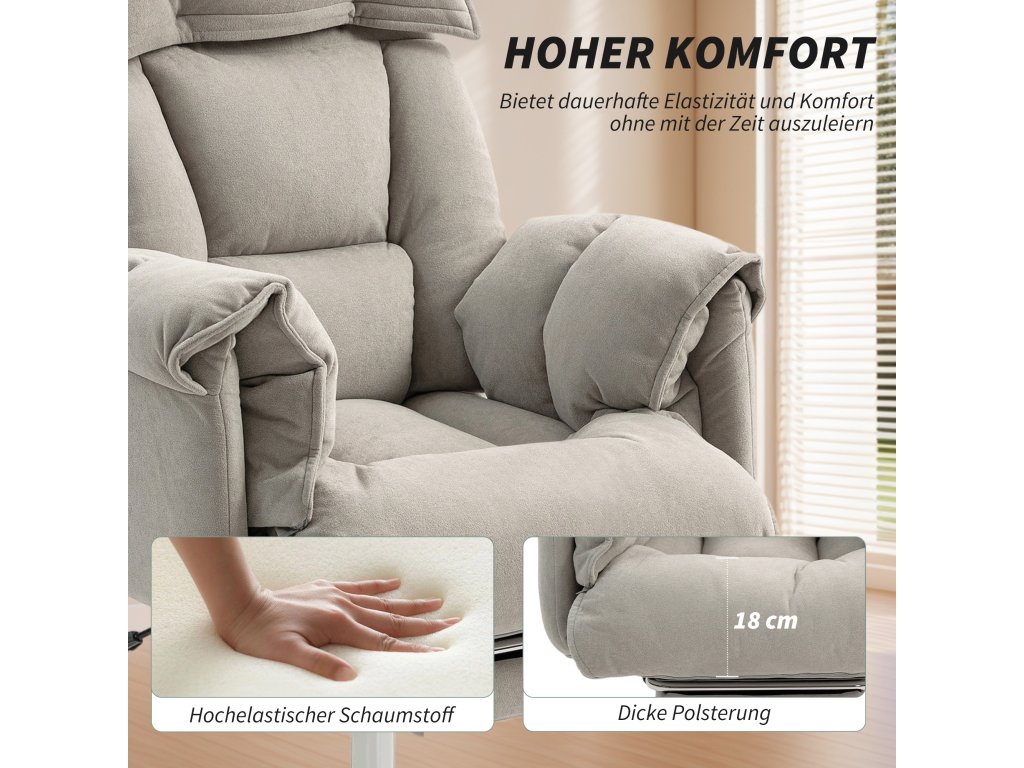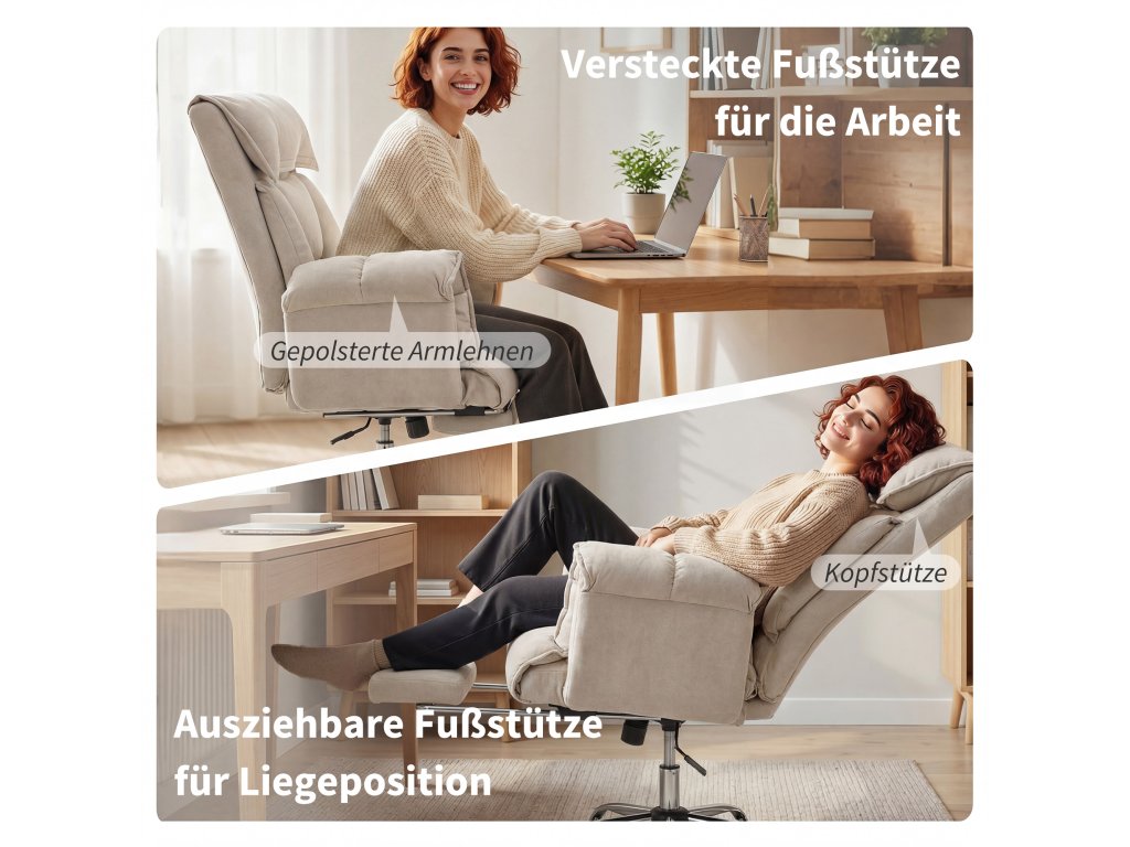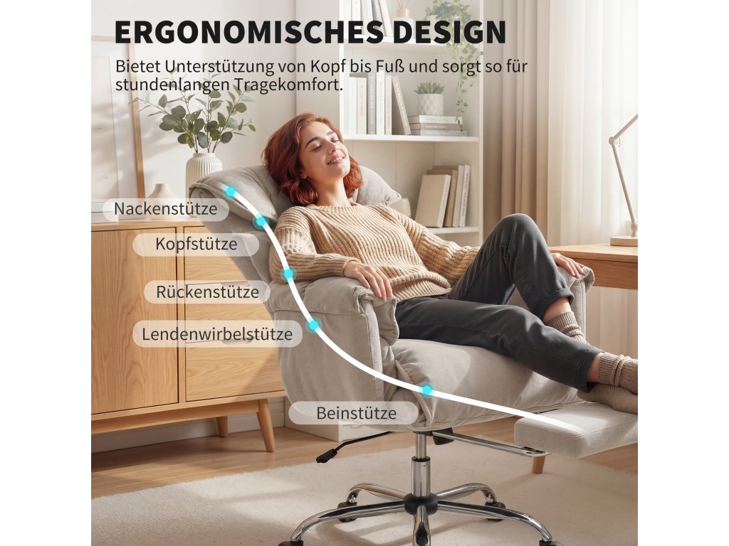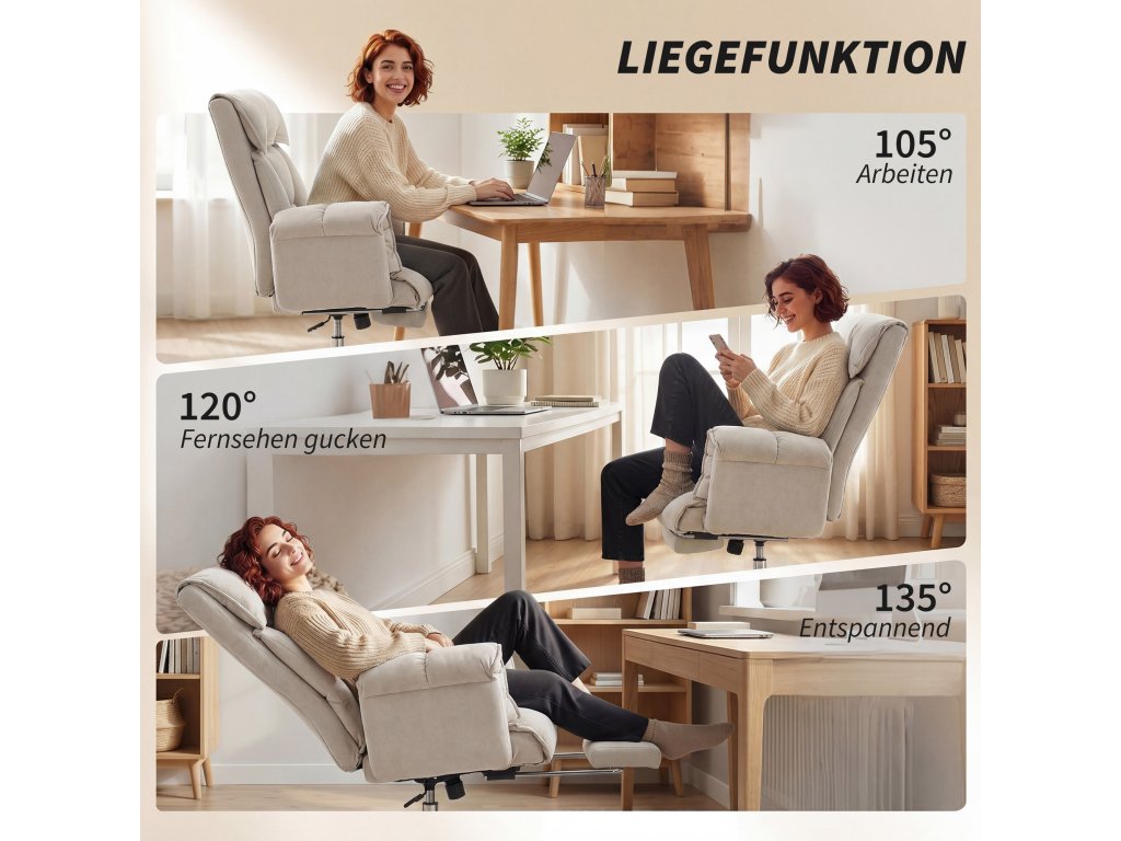 Nastavitelný sklon a opěrka nohou: Snadné přepínání mezi prací, čtením nebo relaxací. Tato kancelářská židle nabízí tři úhly sklonu (105°/120°/135°) a výsuvnou opěrku nohou pro individuální pohodlí.