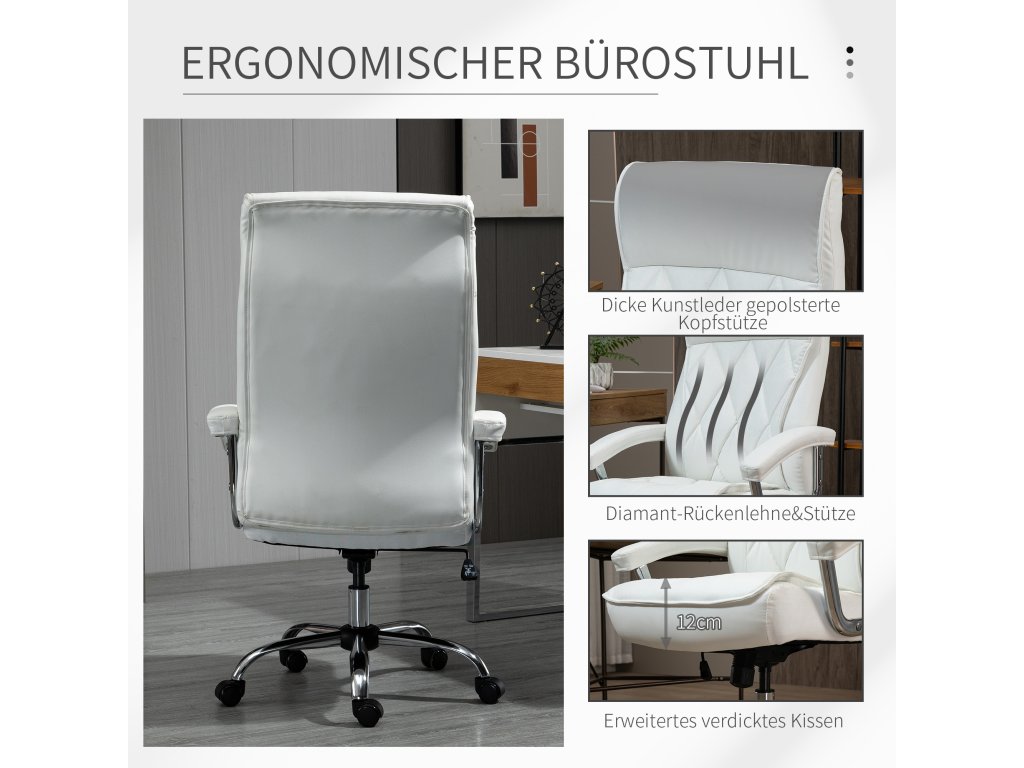 Kancelářská židle Vinsetto, ergonomická kancelářská židle, výškově nastavitelná otočná židle s houpací funkcí, vzor diamantů, imitace kůže, čalouněná manažerská židle, bílá barva