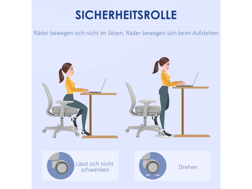 - ✔ Ergonomická kancelářská židle s bezpečnostními kolečky, která se v poloze vsedě neotáčejí a v poloze mimo sezení se mírně natáčejí