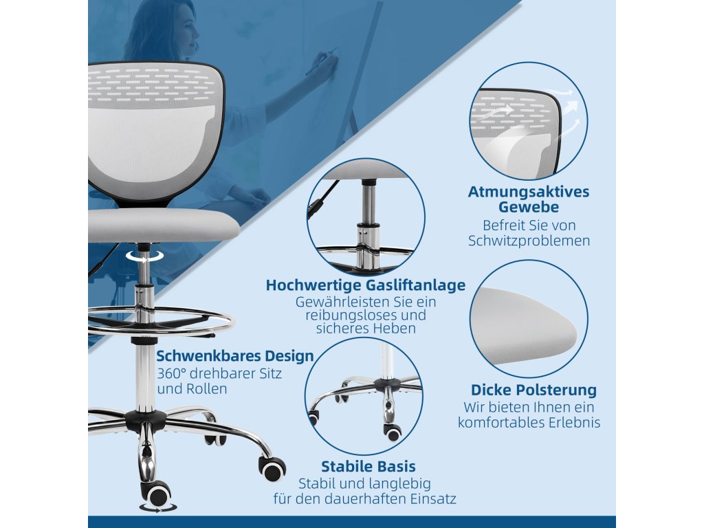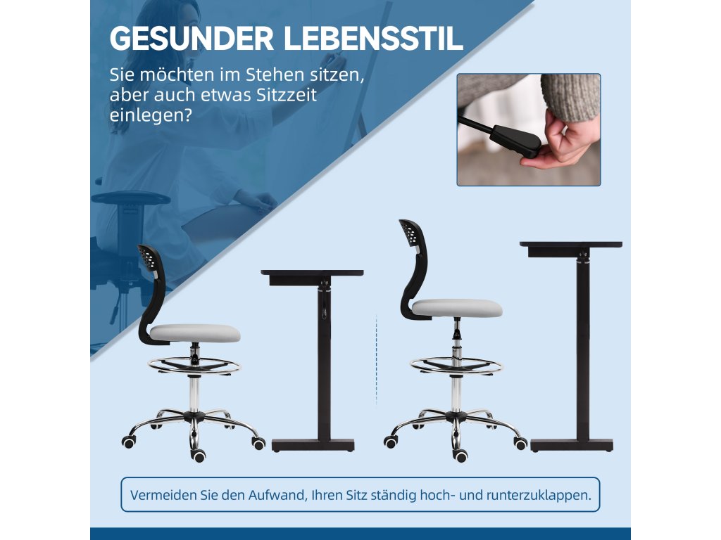 Pohodlná a s dobrou oporou: Tato počítačová židle pro stání má polstrovaný sedák, který zaručuje pohodlné sezení i při delší práci. Opěradlo podporuje správné držení těla a je potaženo prodyšnou síťovinou.