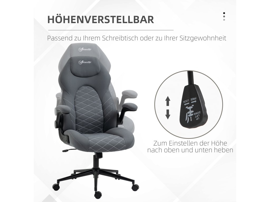 Židle Vinsetto PC nabízí pohodlí a funkčnost v jednom. Díky funkci houpání se můžete pohodlně opřít a relaxovat. Sedák je výškově nastavitelný v rozmezí 46 až 56 cm, což zajišťuje optimální polohu při sezení. Sklopné područky šetří místo, když nejsou potřeba. Prodyšný a snadno udržovatelný potah z mikrovlákna zajišťuje mimořádně pohodlné sezení, takže se budete vždy cítit uvolněně a svěže.