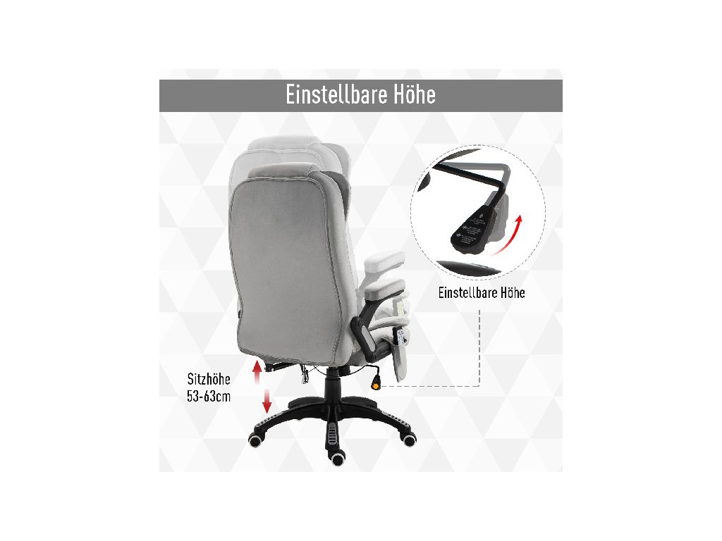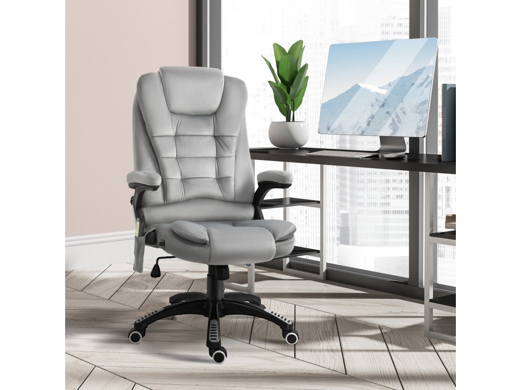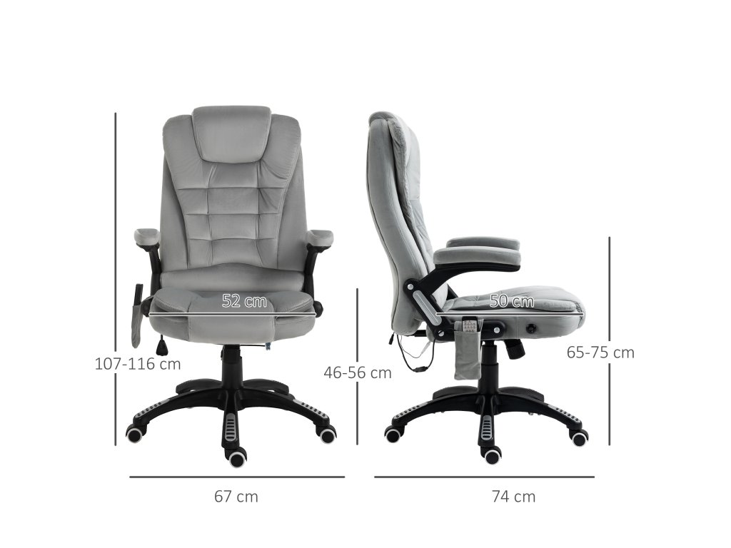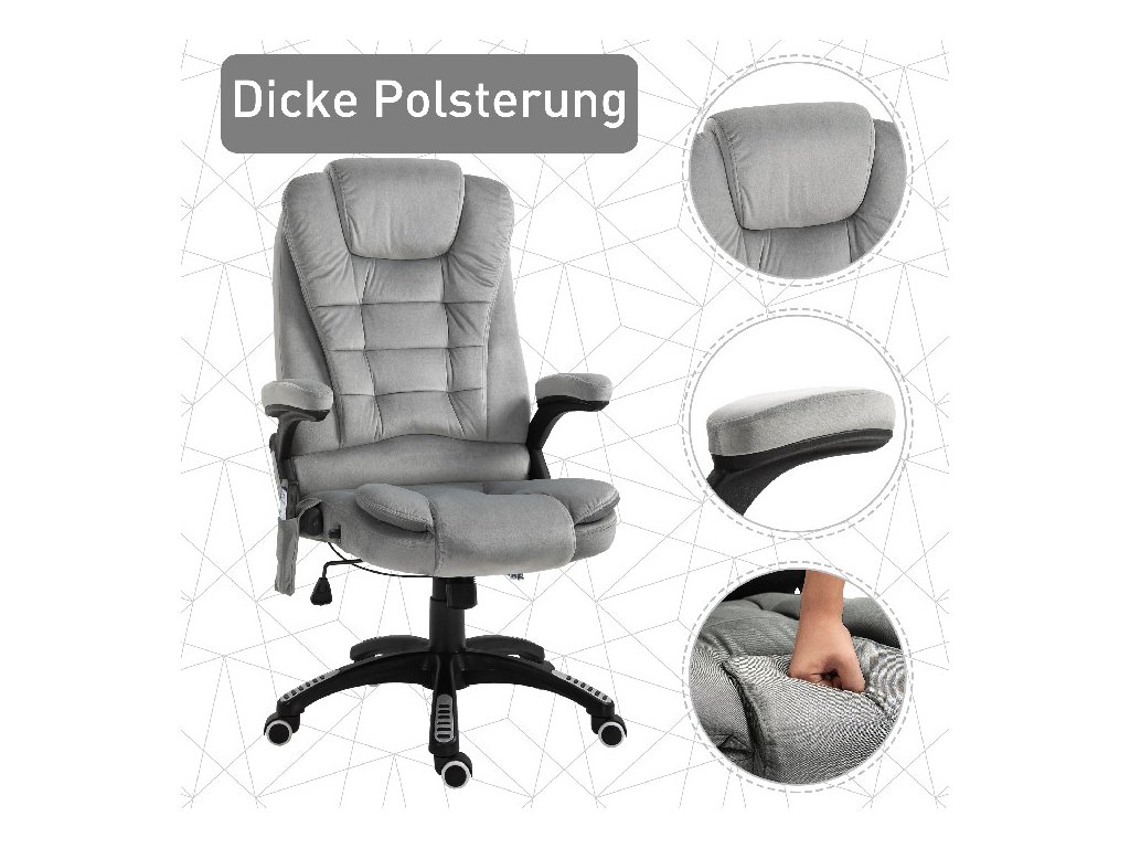 Toto kancelářské křeslo s masážní funkcí od společnosti Vinsetto nabízí nejen pohodlné místo k sezení, ale také dokonalou relaxaci díky masážní funkci a vyhřívacím prvkům. Udělejte si pohodlí na měkkém čalouněném sedadle, opřete se až do úhlu 130° díky nastavitelnému opěradlu a pohodlně ovládejte masážní funkci kancelářského křesla pomocí dálkového ovladače. Prodyšný potah manažerského křesla zajišťuje pohodlné sezení při jakékoli teplotě.