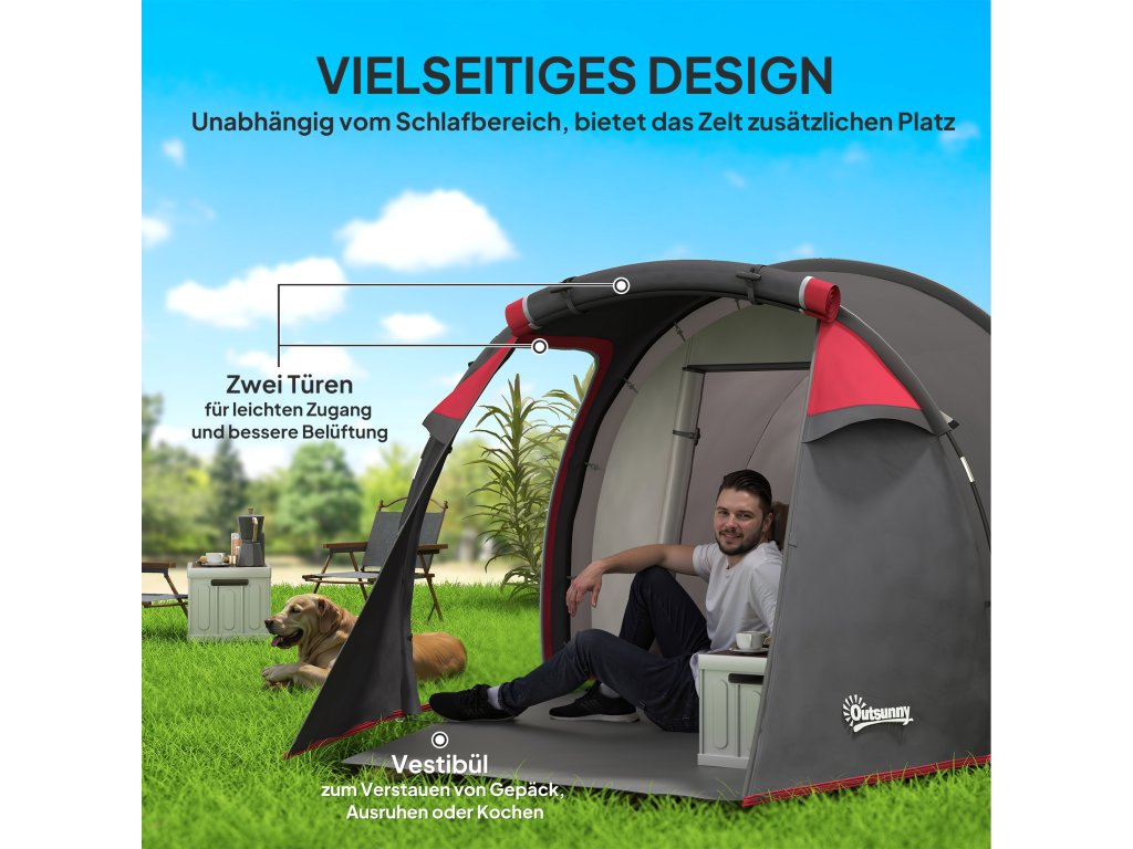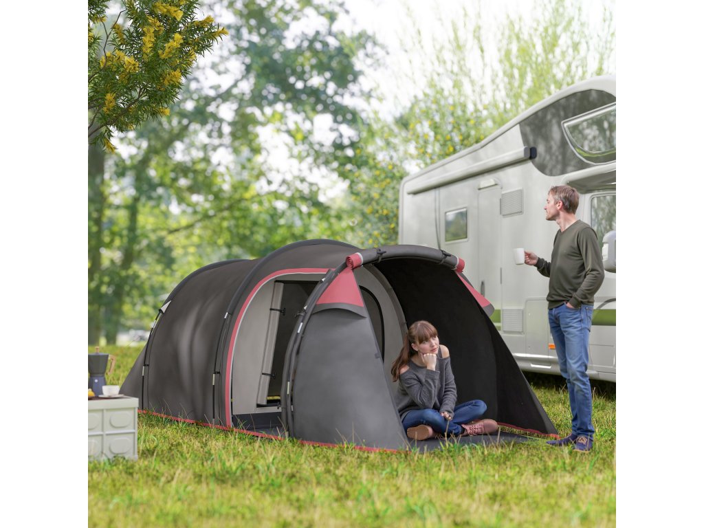 - Dvoupokojová konstrukce: Oddělená předsíňka s markýzou a dvěma dveřmi je oddělena od prostoru na spaní, což poskytuje další stín pro posezení, přezouvání, uložení zavazadel a vybavení a dokonce i vaření.
