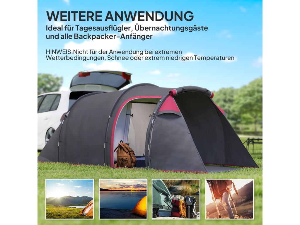 - Vysoce kvalitní materiál: Dešťovka z nepromokavého polyesteru 190T a silné pružné tyče ze skelných vláken zaručují stabilitu. Kolíky do země a lana udržují stan stabilizovaný ve větru