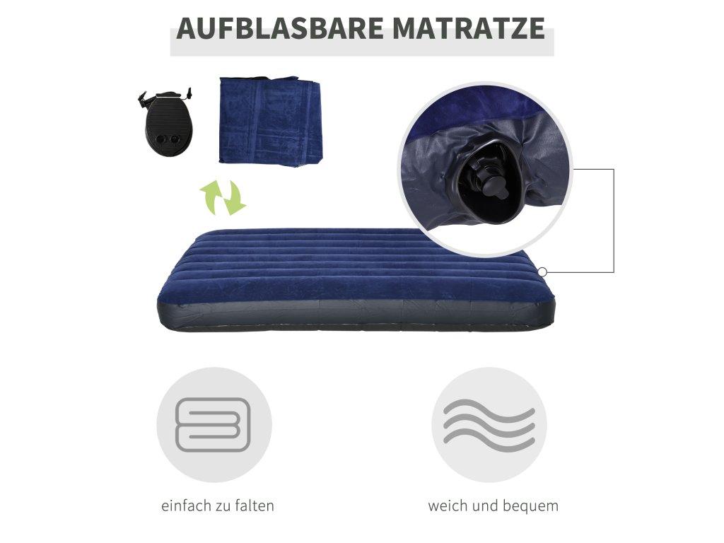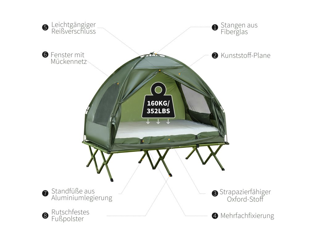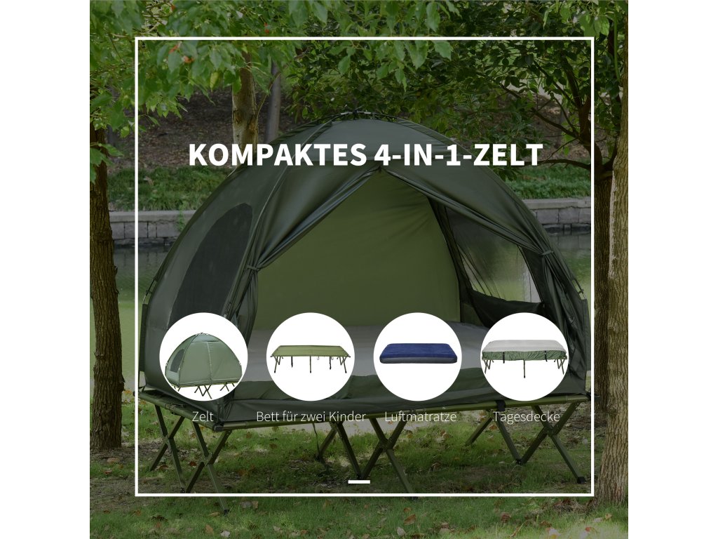 Kompletní balíček pro milovníky přírody! S naší sadou stanu a postýlky Outsunny budete vy a váš partner perfektně vybaveni na váš příští výlet. Tato sada obsahuje postýlku, stan, nafukovací matraci a deku pro dvě osoby. Díky izolační vzduchové vrstvě a zvýšené světlé výšce budete výjimečně dobře chráněni před chladem a vlhkem. Voděodolná tkanina stanu a praktická síťovaná okna také poskytují spolehlivou ochranu před sluncem a hmyzem.