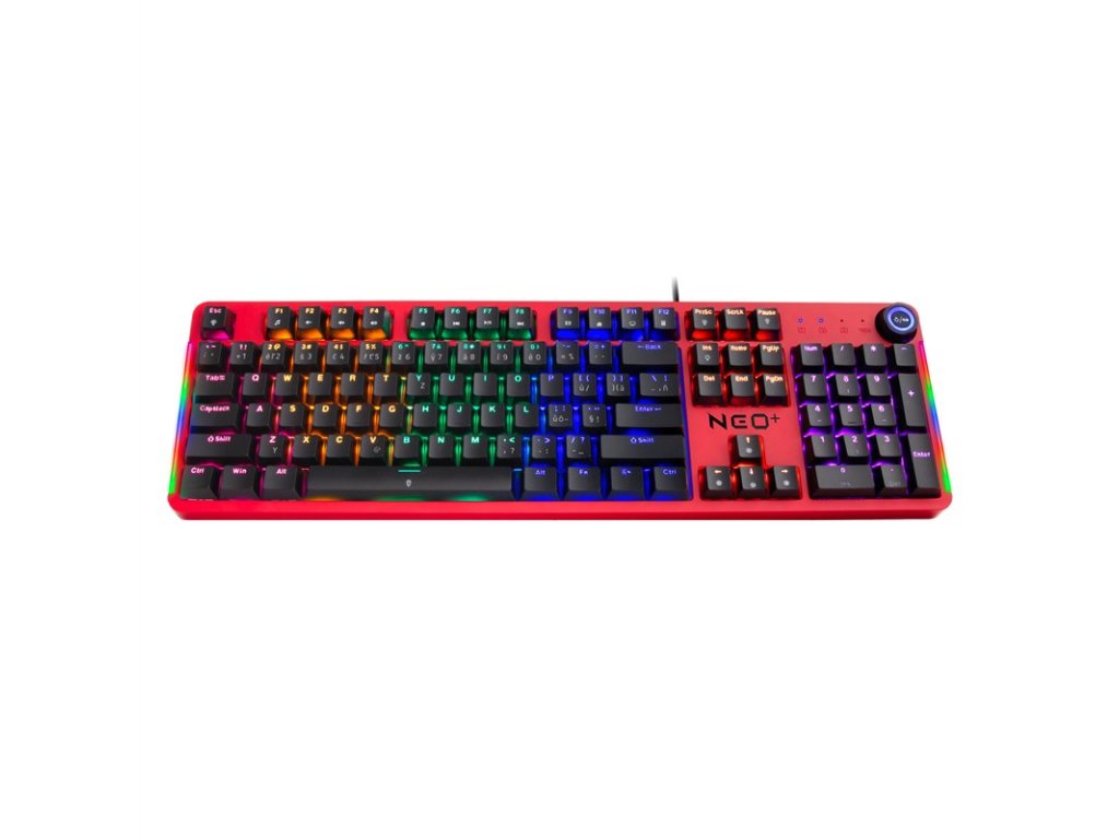 Profesionální mechanická klávesnice NEO2 + series pro hráče počítačových her v českém a slovenském layoutu s devíti módy barevného Rainbow podsvícení. K dispozici je 12 multimediálních kláves a otočné kolečko pro nastavení hlasitosti a dalších funkcí.