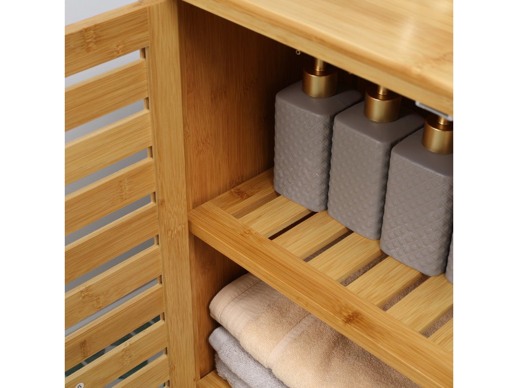 - Bambusová konstrukce: Vyrobena z robustního přírodního bambusu, který nabízí teplý a přirozený vzhled. Žaluziová dvířka a police boční skříňky zajišťují nejen dobré větrání, ale také dodávají skříňce stylový nádech