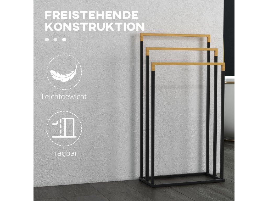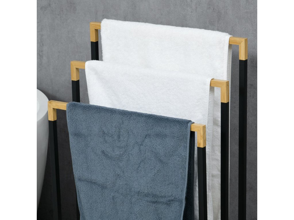Pověste si ručníky na tento praktický věšák na ručníky se 3 kolejnicemi od společnosti kleankin. Věšák na ručníky je vyroben z robustního bambusu a kovu, který má přírodní vzhled a je vhodný pro každodenní použití, zatímco kolejnice věšáku na ručníky jsou vyrobeny z odolného, snadno čistitelného bambusu. Díky volně stojícímu provedení jej můžete umístit vedle sprchy, vany nebo kamkoli chcete.