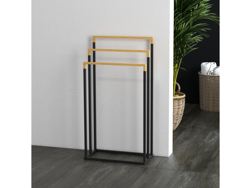 kleankin věšák na ručníky sada 3 věšáků na ručníky, průmyslový design, bambus, 45 x 22,5 x 86 cm, černá + příroda