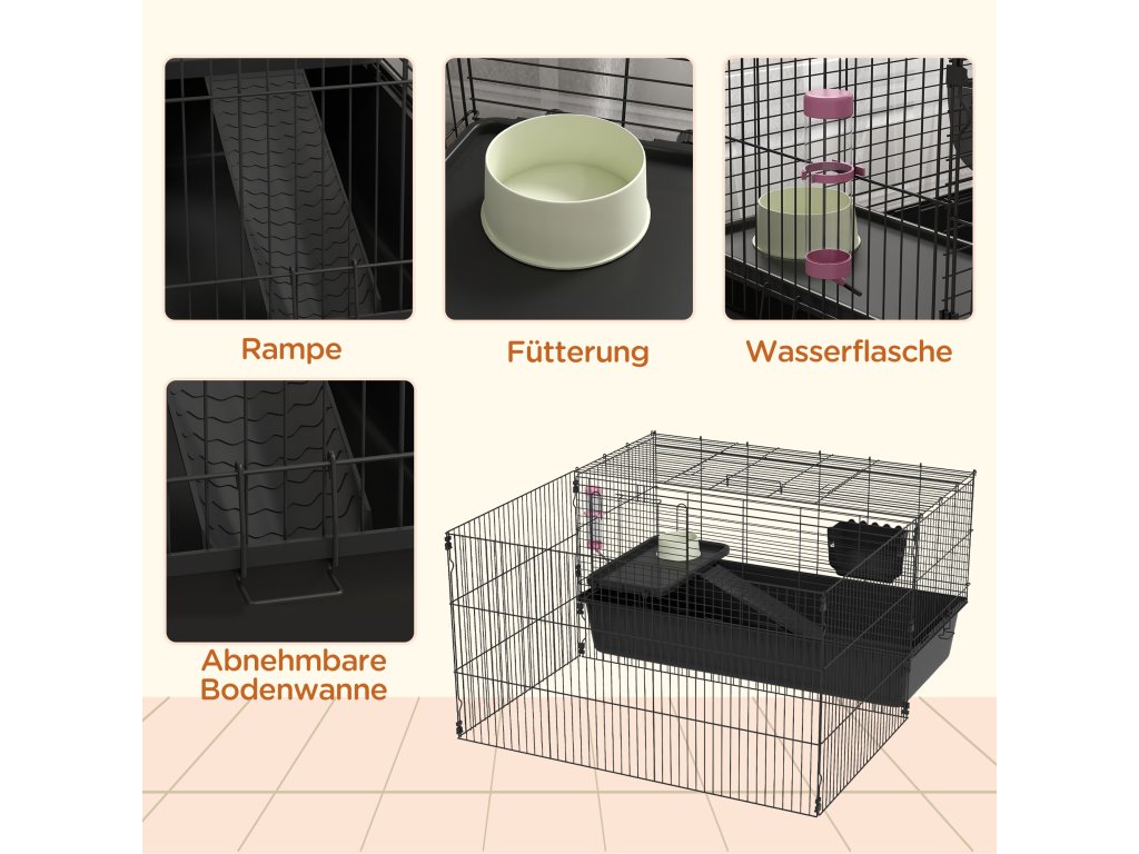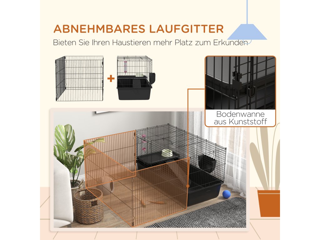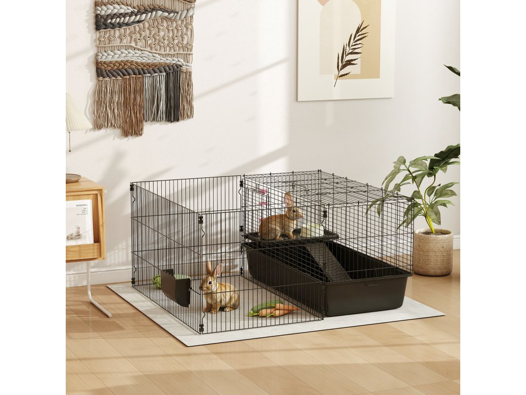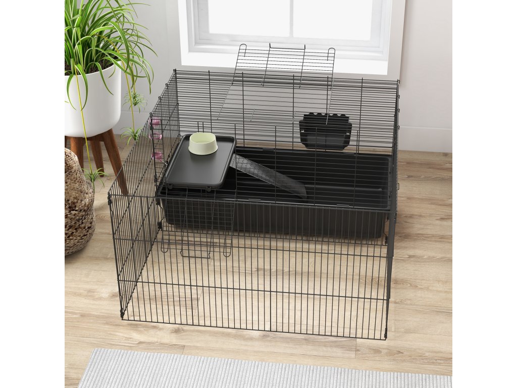 Klec pro malá zvířata PawHut s odnímatelným výběhem, ohrádka s boudou, včetně příslušenství, černá