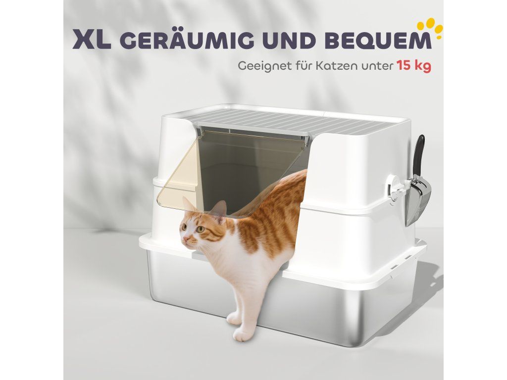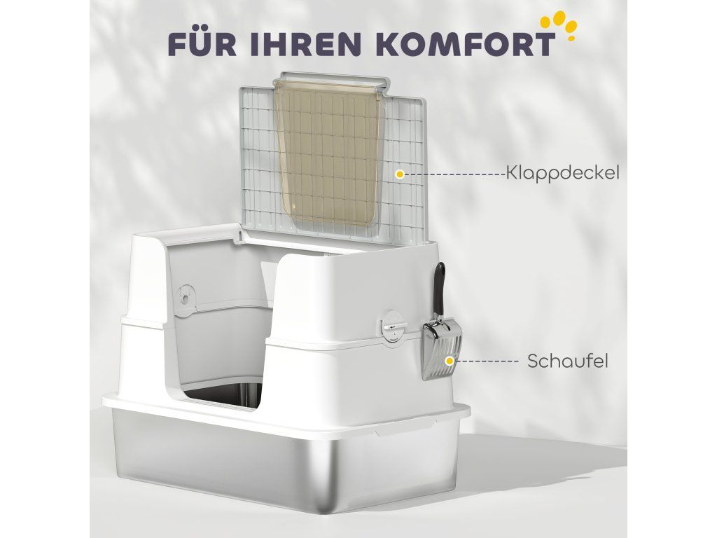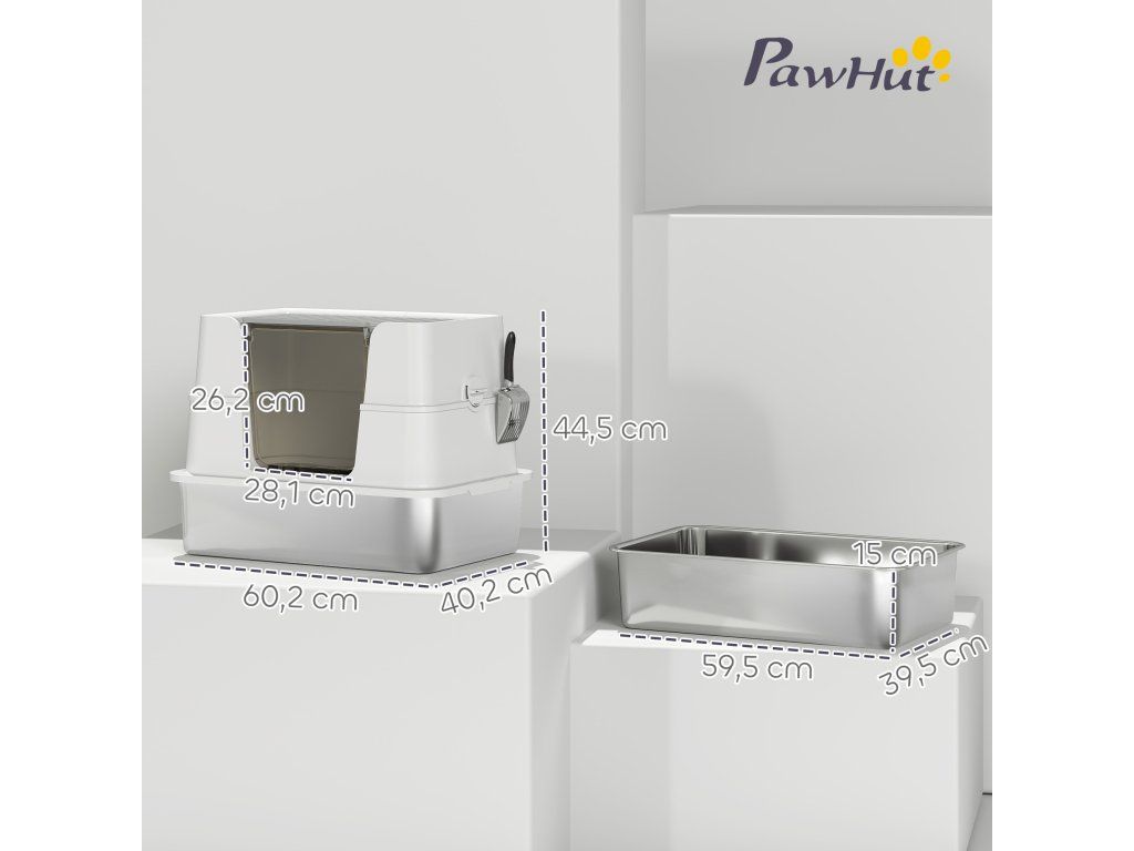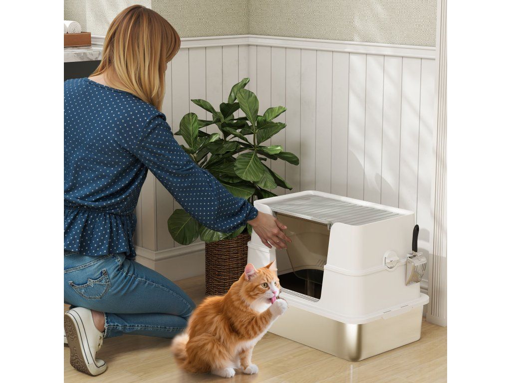Kočičí toaleta PawHut, nerezová ocel, vnitřní velikost XL, s naběračkou, světle šedá