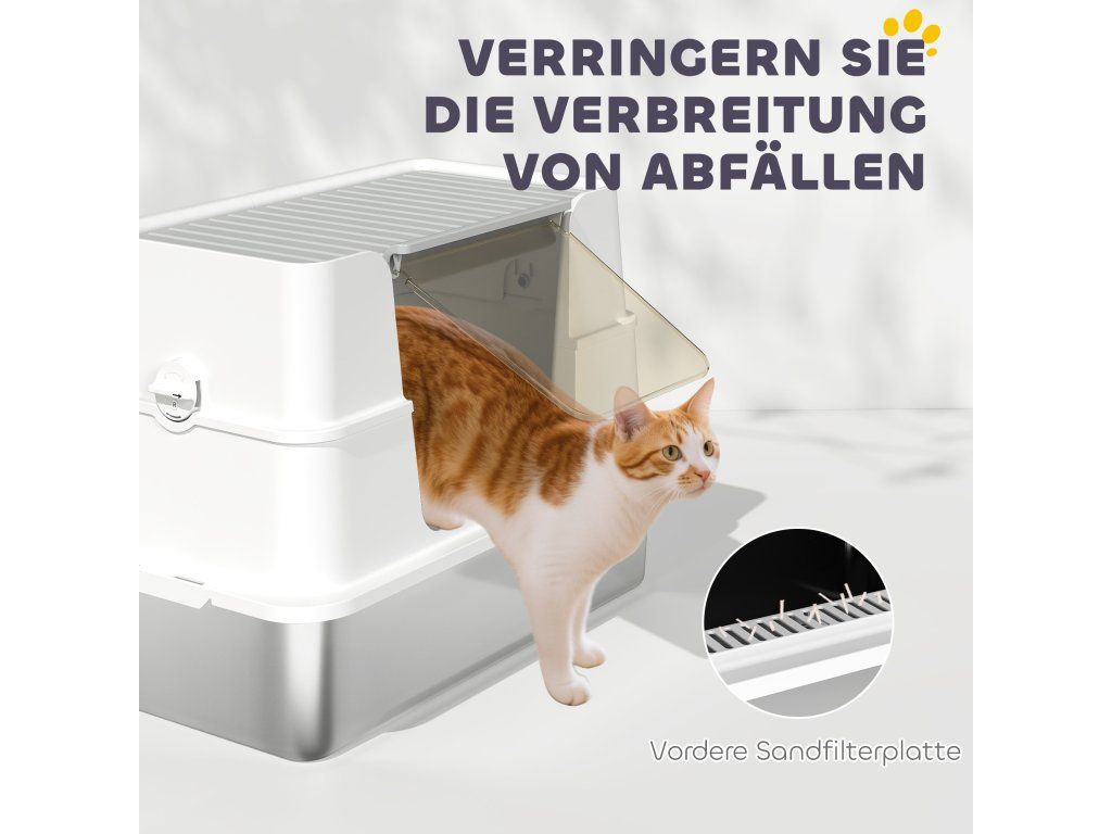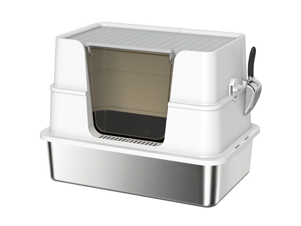 Dvojitý vstup: Díky přednímu a hornímu vstupu si vaše kočka může vybrat, jak do toalety vstoupí. Horní vstup také minimalizuje rozsypávání steliva.