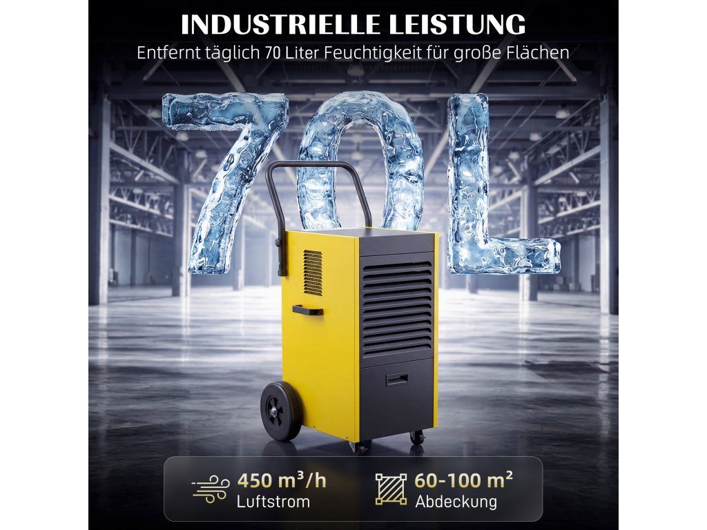 Průmyslový výkon: S odvlhčovací kapacitou až 70 litrů denně a průtokem vzduchu 450 m³/h tento odvlhčovač rychle vysuší velké plochy o rozloze 60-100 m² a chrání váš cenný majetek před vlhkostí.
