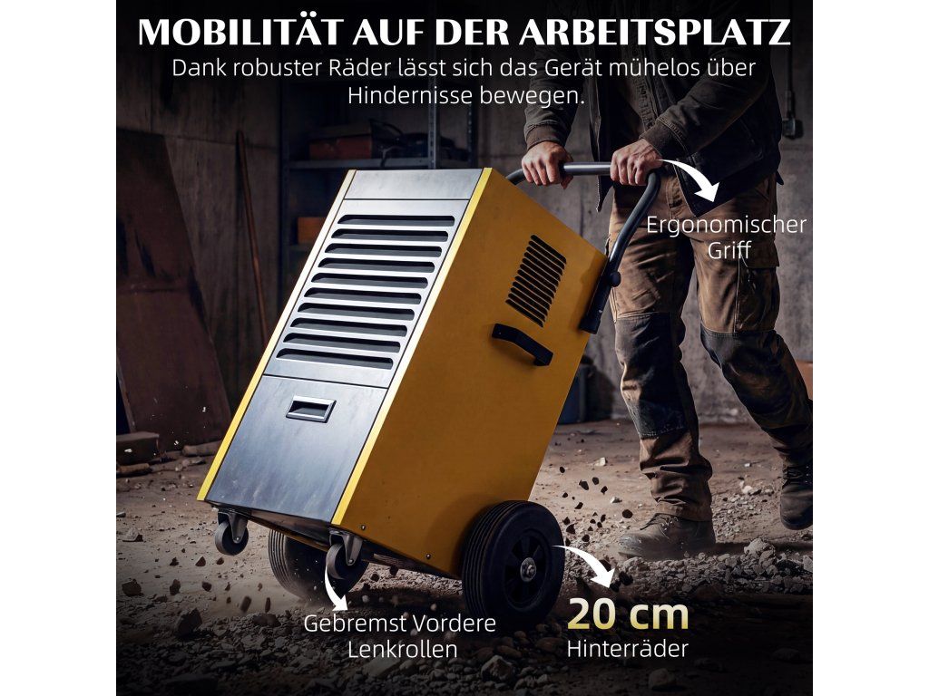 Mobilita na staveništích: Ideální pro náročné prostředí: Díky robustní rukojeti, velkým 20cm zadním kolům a brzděným předním kolům lze odvlhčovač snadno přepravovat přes překážky, jako jsou sutiny nebo schody.