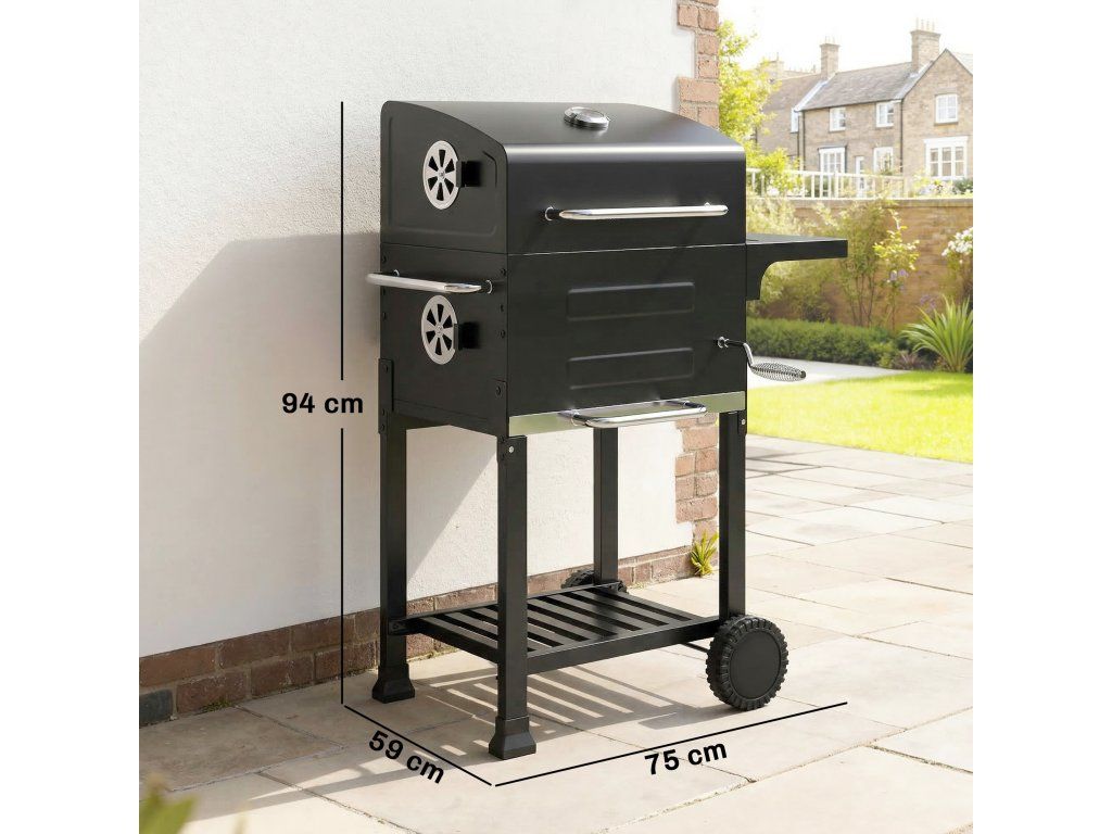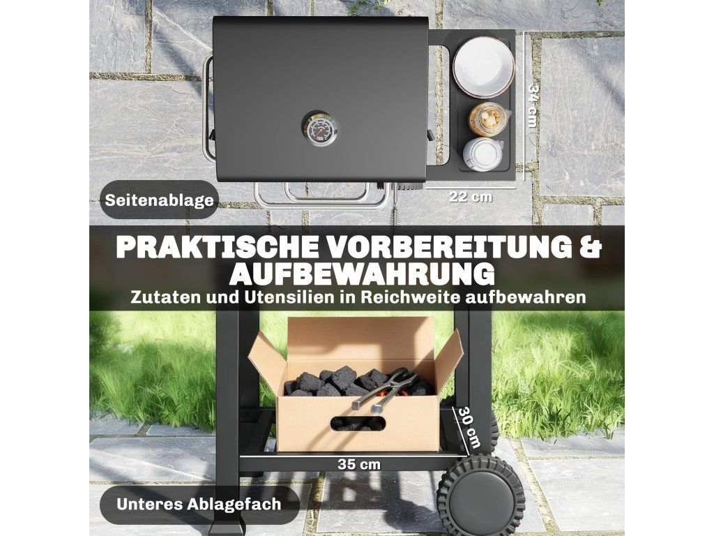Přesná regulace teploty: Teploměr °C/°F ve víku vám pomůže přesně sledovat teplotu. Díky čtyřem nastavitelným větracím otvorům můžete optimálně regulovat proudění vzduchu grilovacího vozíku pro perfektní výsledky grilování.
