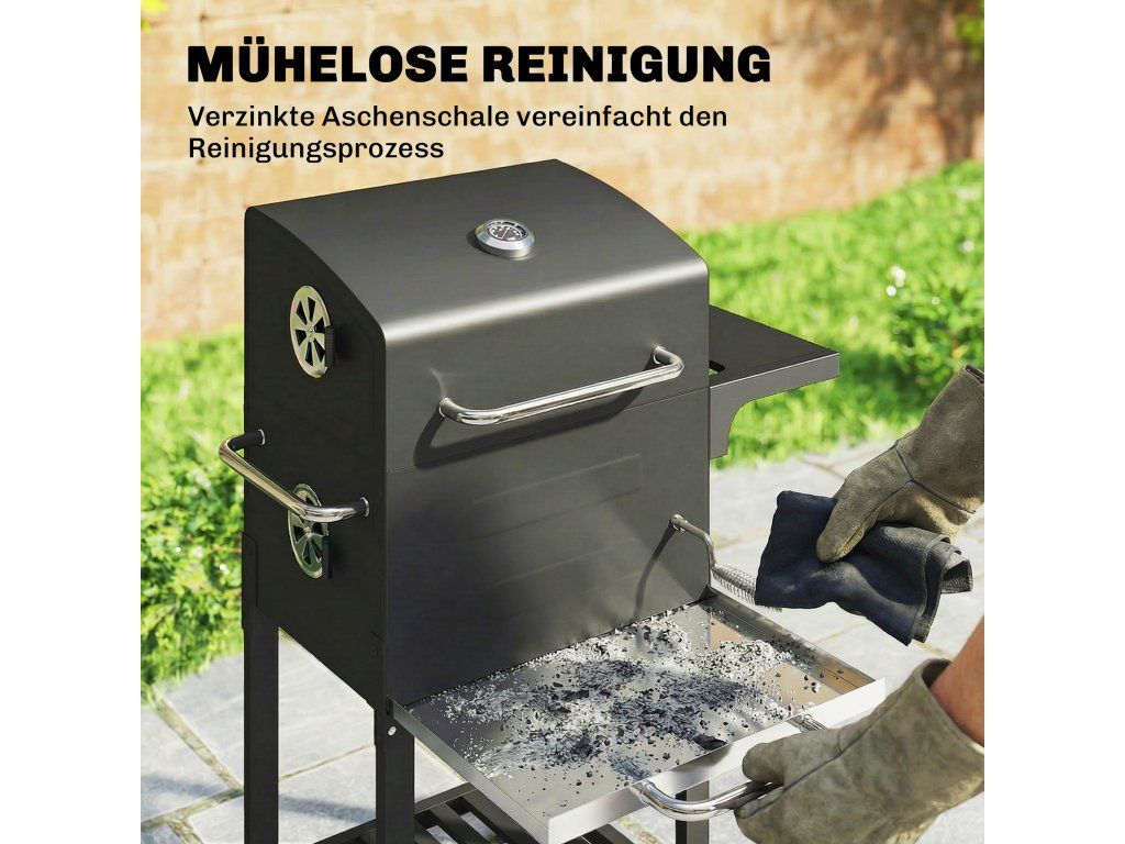 Kompaktní grilovací vozík na dřevěné uhlí Outsunny s víkem, teploměrem, roštem, bočním stolkem, popelníkem a větracími otvory