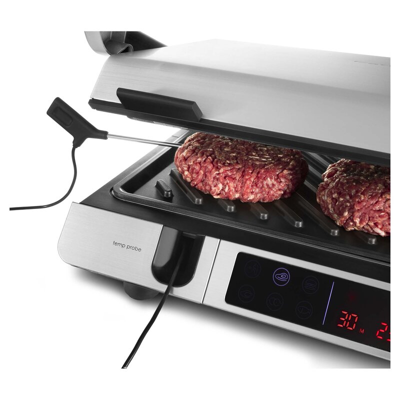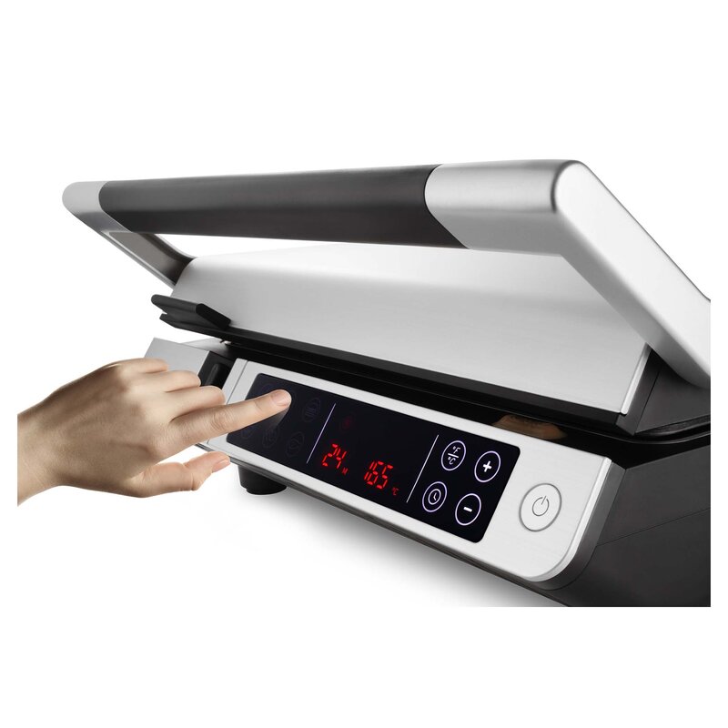 Na velkém, dobře čitelném dotykovém displeji si můžete zvolit z 6 nastavených programů od steaku po panini. Gril je vybaven časovačem, který vám pohlídá dobu grilování z jedné i druhé strany pokrmu.