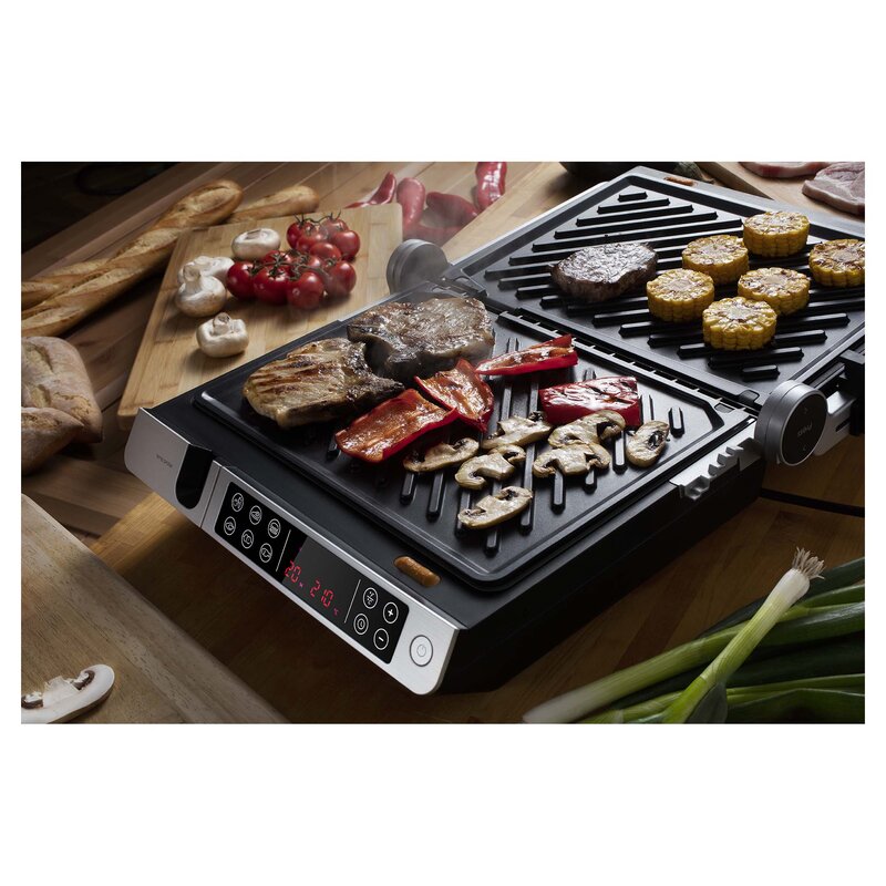 Kontaktní gril se výborně hodí nejen pro masa, špízy, zeleninu, které jsou ugrilovány rychleji z obou stran, ale také pro vejce, tousty nebo panini. Pokud potřebujete grilovat více pokrmů, jednoduše stiskem tlačítka proměníte kontaktní gril na BBQ gril a získáte velkou grilovací plochu pro steaky nebo ryby.