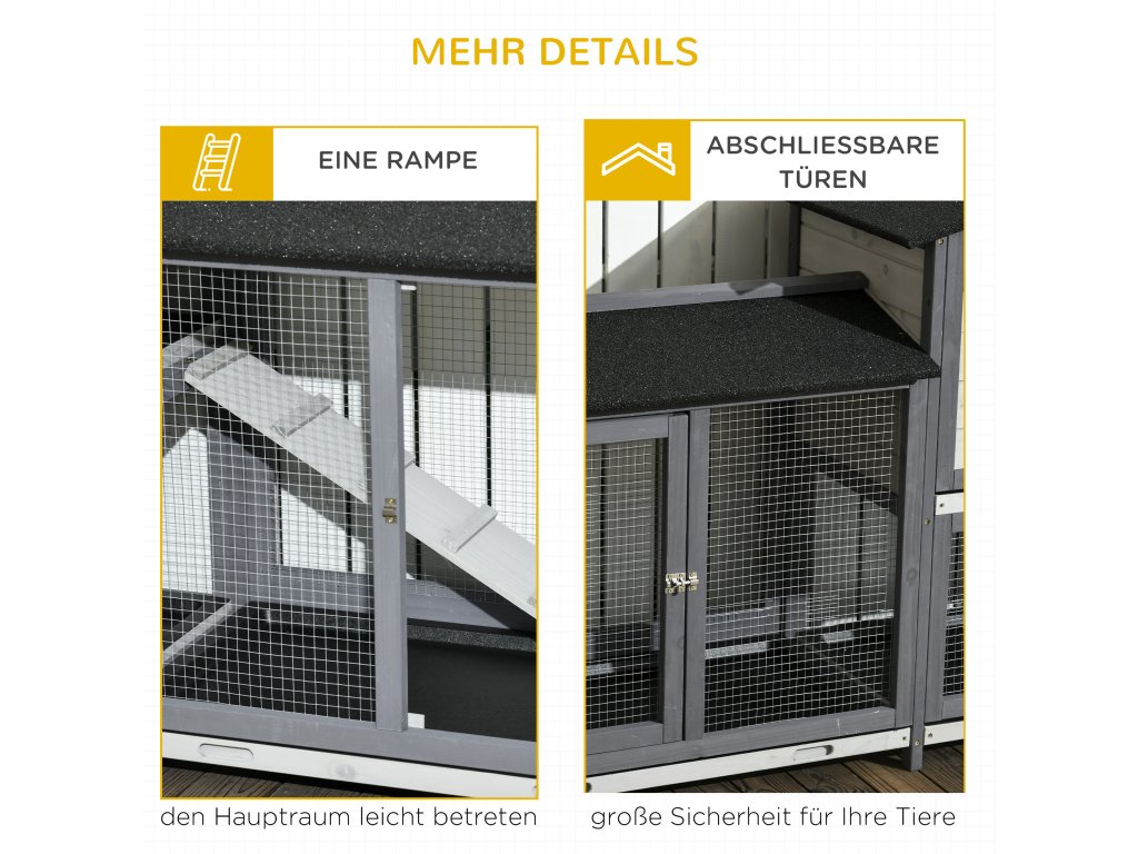 Kotce pro malá zvířata s venkovním výběhem včetně rampy, asfaltová střecha, jedlové dřevo, šedá