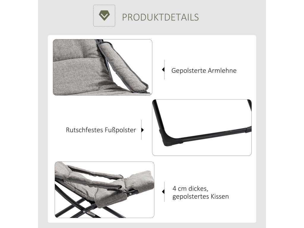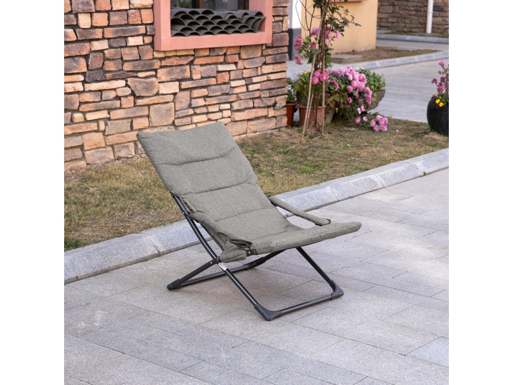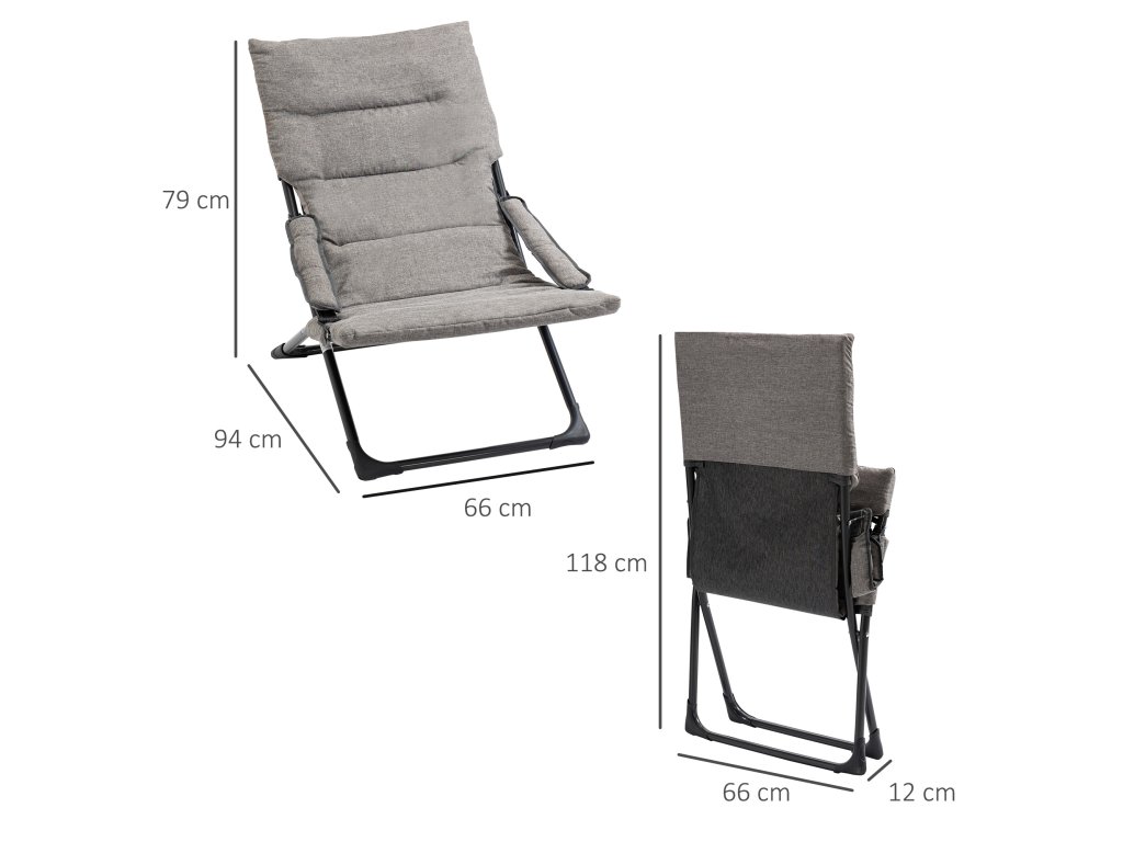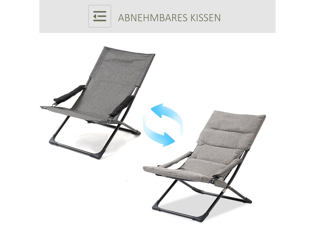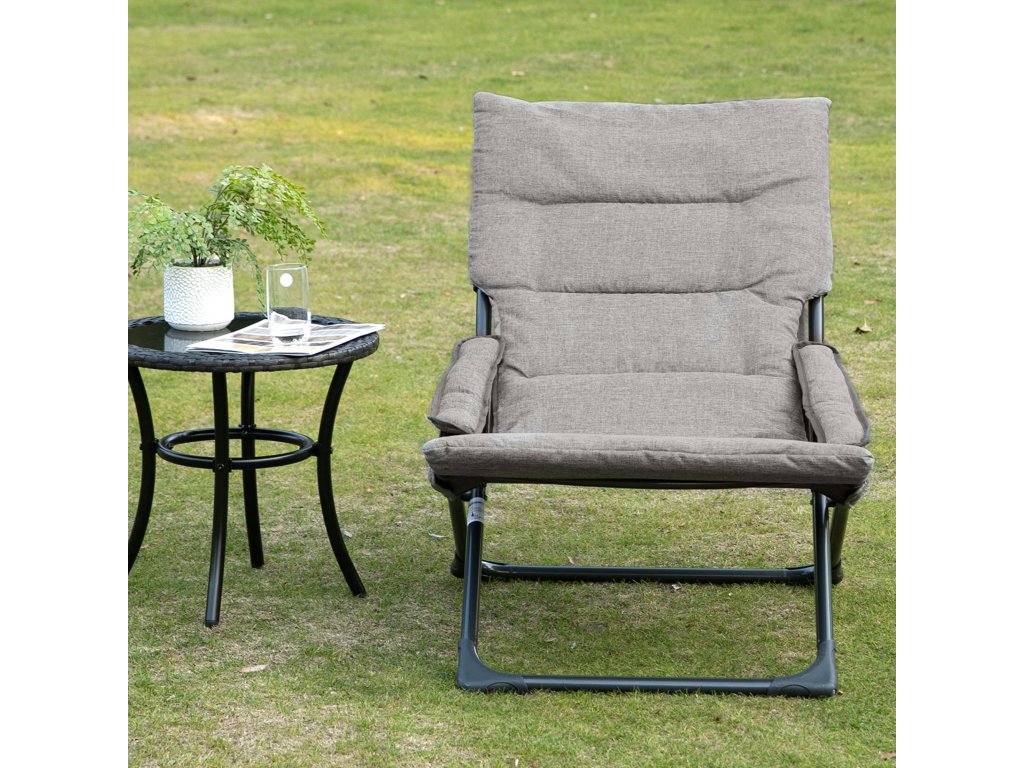 Kovová zahradní židle Outsunny, skládací židle s odnímatelným polštářem, odolná proti povětrnostním vlivům, skládací kempingová židle, lehátko, nosnost 120 kg, posezení do zahrady, na terasu, na balkon, 66Š x 94H x 79V cm, šedá