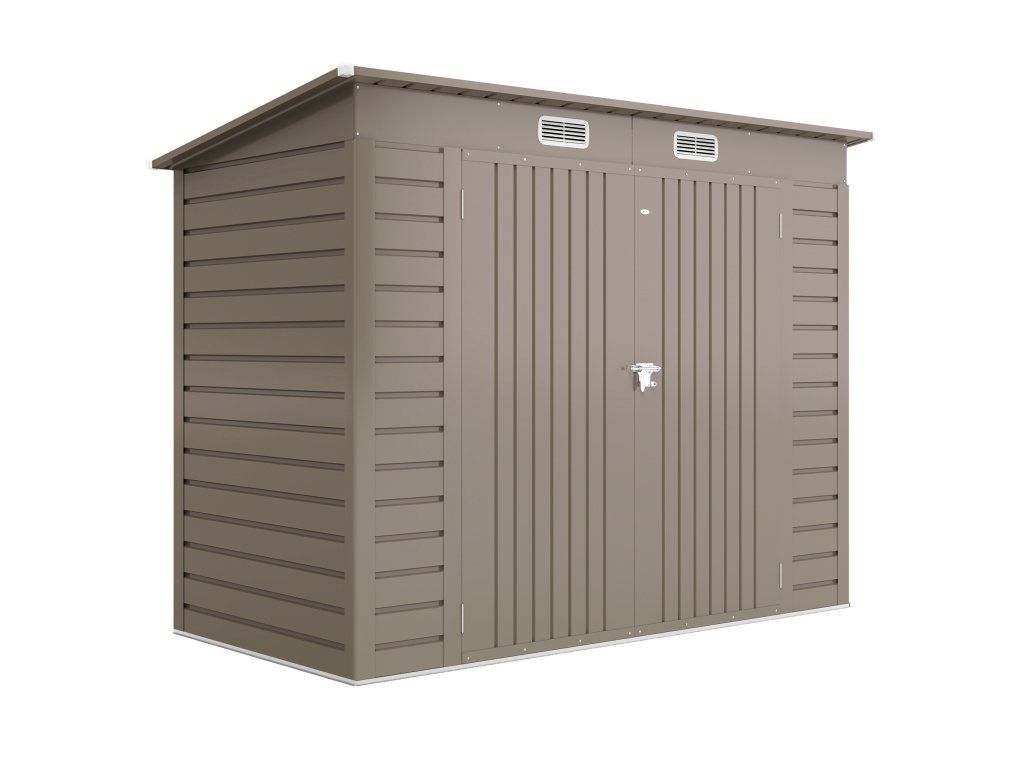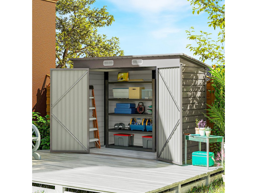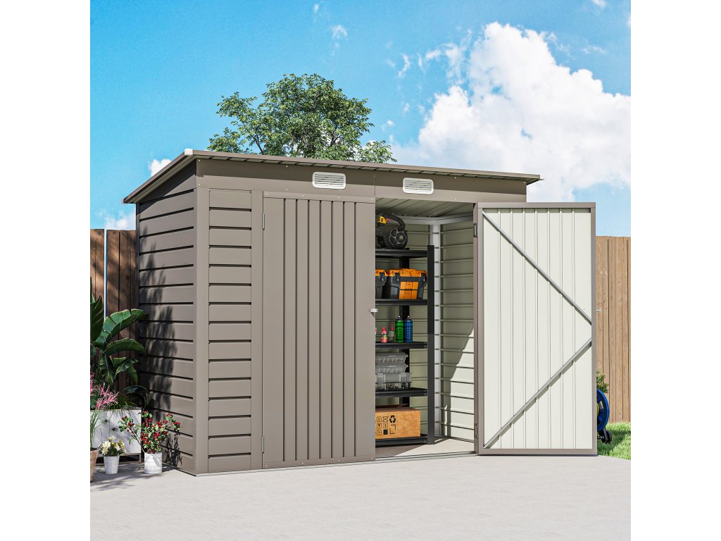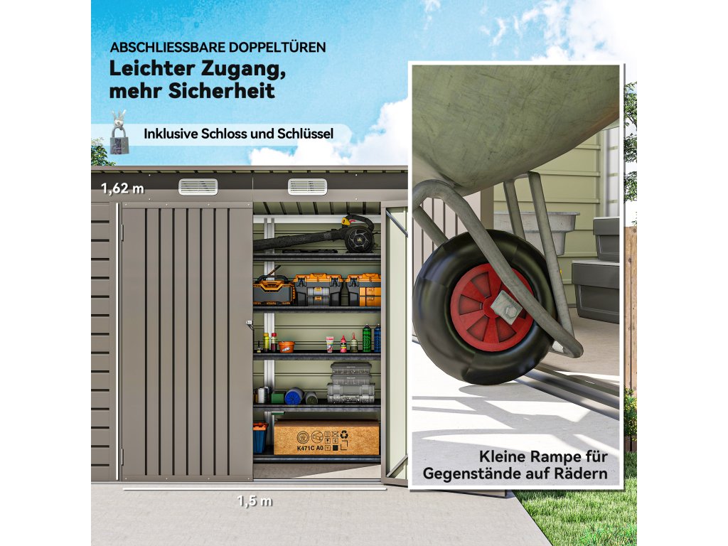 ✔ Dvojité dveře na kovovém zahradním domku poskytují pohodlný přístup a západka nabízí větší bezpečnost.