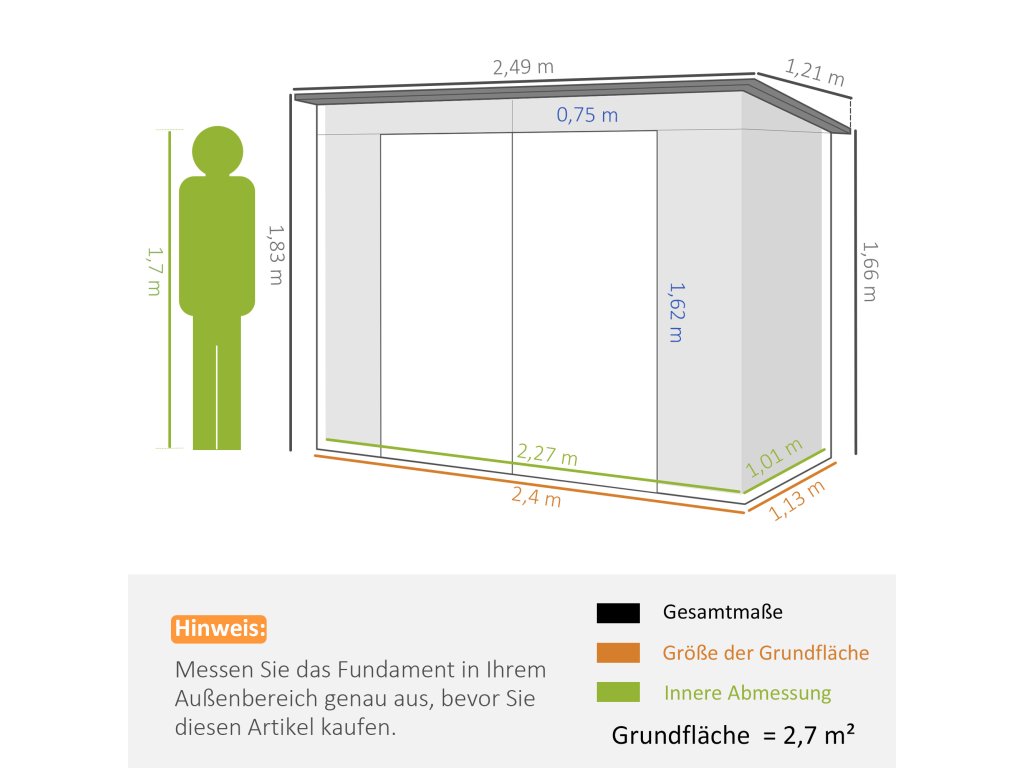 Celkové rozměry zahradního domku: 249D x 121Š x 166/183V cm. Vnitřní rozměry: 227D x 101Š cm. Podlahová plocha: 240D x 113Š cm, 2,7 m². Montážní rukavice jsou součástí dodávky. Pro montáž se doporučují 2–3 osoby.