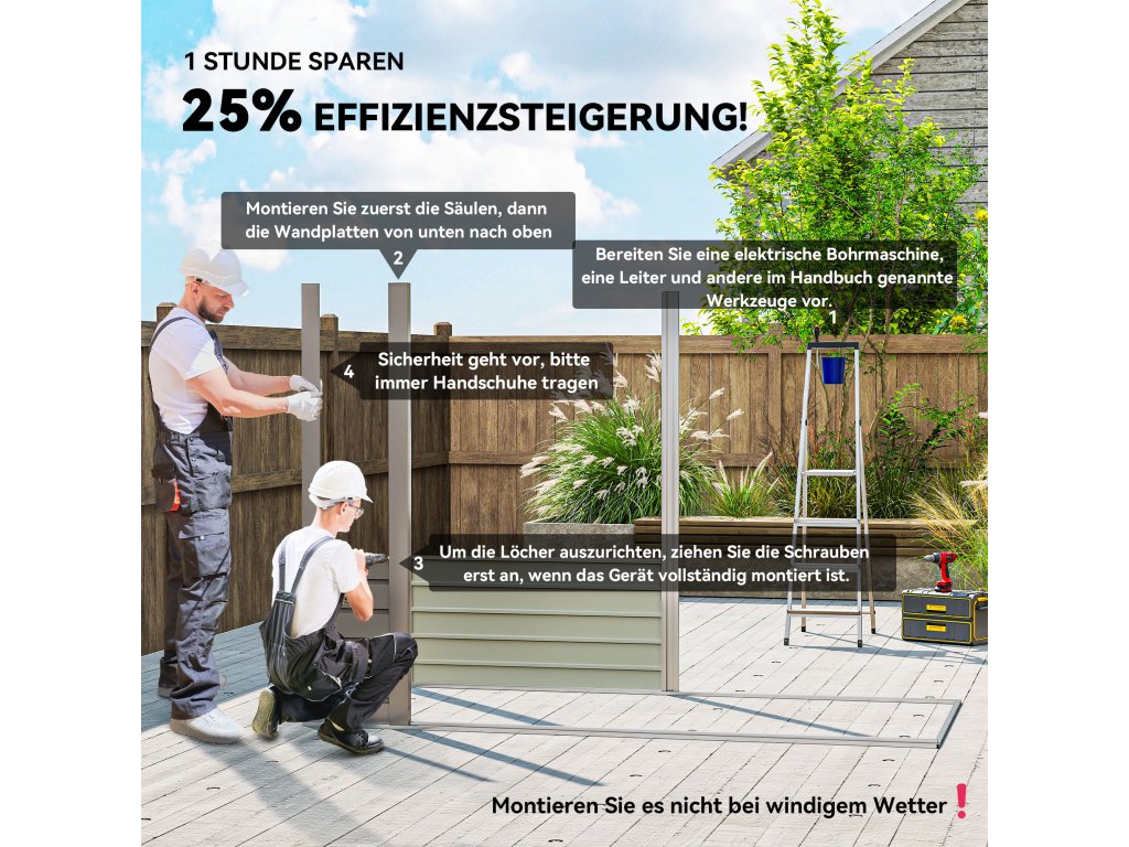 Rychlá montáž: Na rozdíl od běžných zahradních domků se svislými panely naše inovativní horizontální stěnové panely výrazně zkracují dobu montáže a zvyšují efektivitu o 25 %.