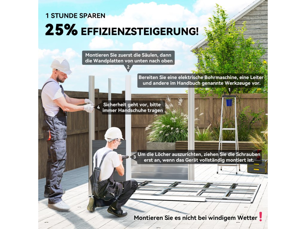 Ušetřete až JEDNU hodinu: Na rozdíl od tradičních zahradních domků se složitými vertikálními panely naše inovativní horizontální stěnové panely výrazně zkracují dobu montáže a zvyšují efektivitu montáže o 25 %.
