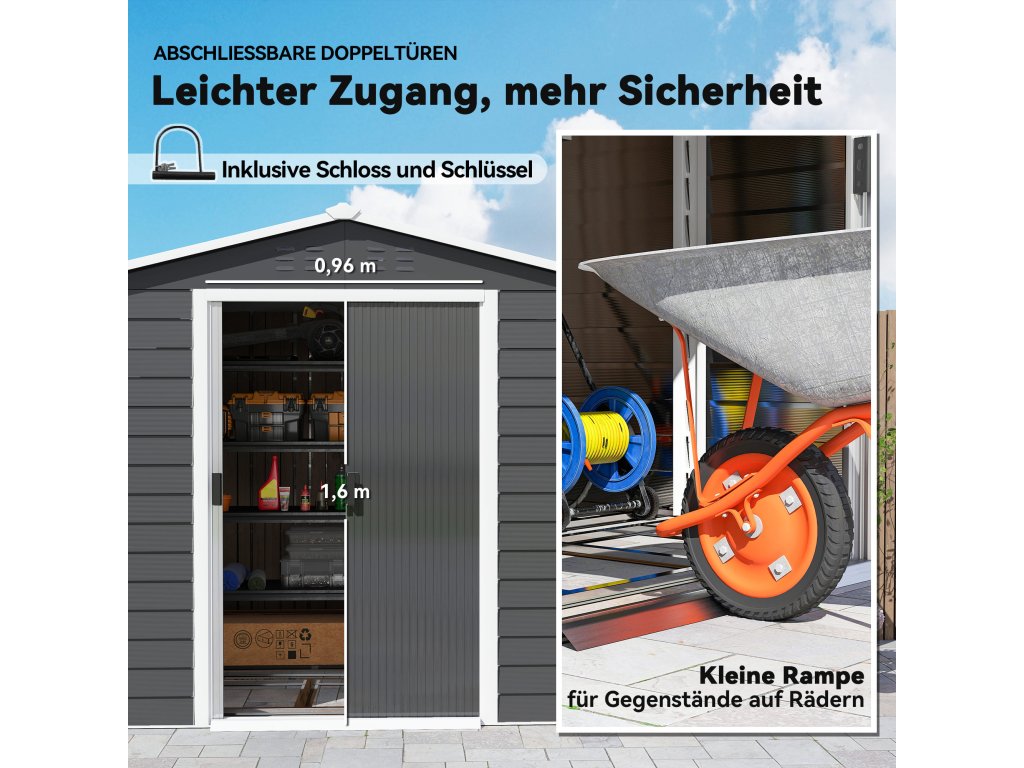 Bezpečný a zabezpečený: Chraňte své nářadí a vybavení dodaným visacím zámkem. S vědomím, že vaše venkovní vybavení je bezpečně uloženo v kovovém zahradním domku, si můžete užít den s rodinou.