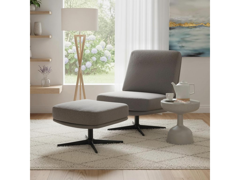 Otočení o 360°: Oba díly sady, čtecí křeslo a podnožka, jsou vybaveny plynule otočnými podnožkami o 360°, které vám umožní snadno nastavit výhled k oknu nebo se zapojit do konverzace. Tato funkce nabízí maximální flexibilitu a činí váš relaxační prostor obzvláště příjemným.
